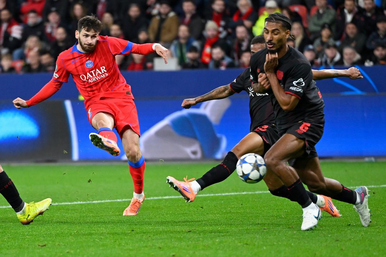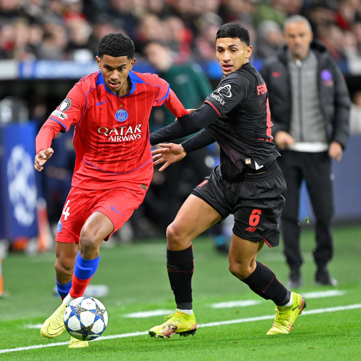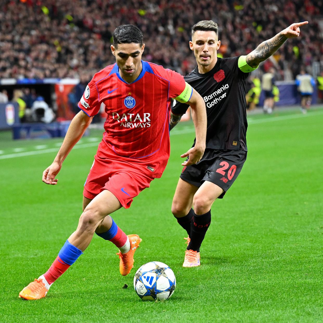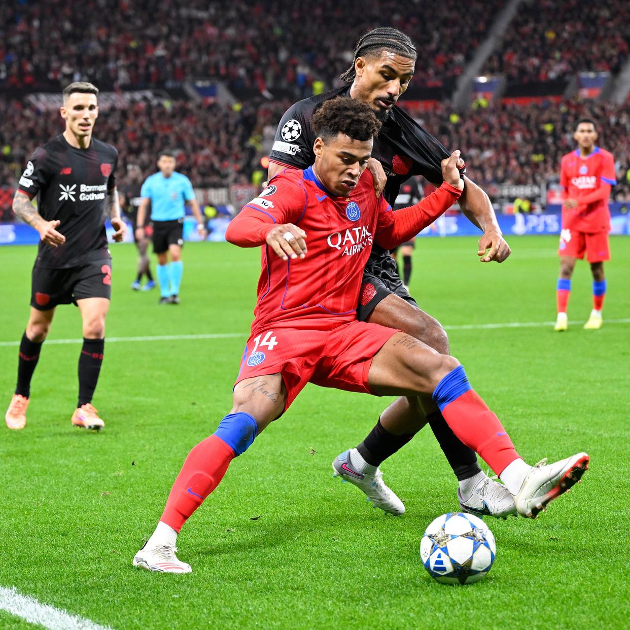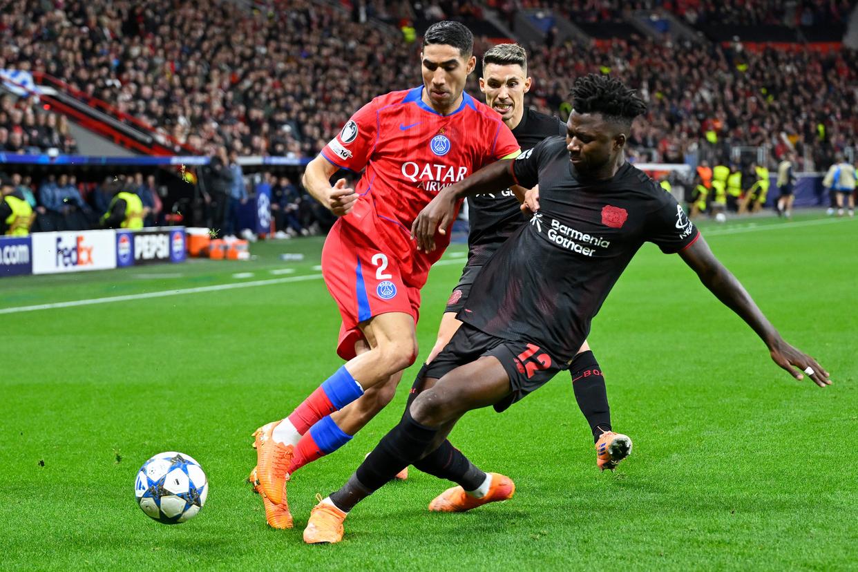 10月21日,勒沃库森队球员塔普索巴(右)和巴黎圣日耳曼队球员阿什拉夫(左)在比赛中拼抢。新华社发(乌尔里希·胡夫纳格尔摄)