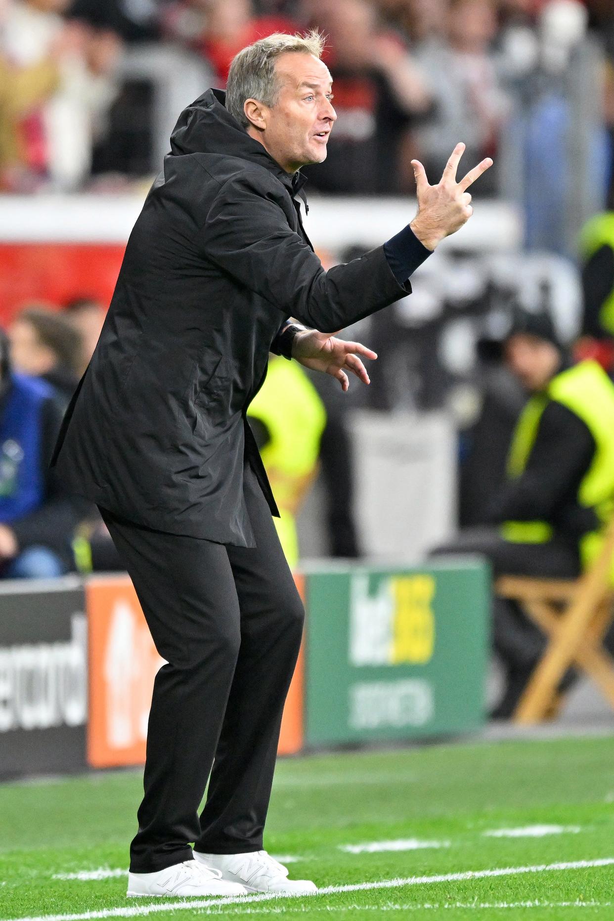 10月21日,勒沃库森队主教练尤尔曼在场边指挥。新华社发(乌尔里希·胡夫纳格尔摄)