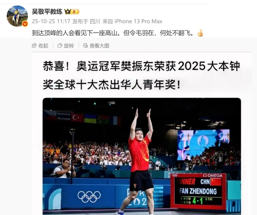 10月25日,前国乒名帅吴敬平发文祝贺樊振东并发文:到达顶峰的人会看见下一座高山。但令毛羽在,何处不翻飞。