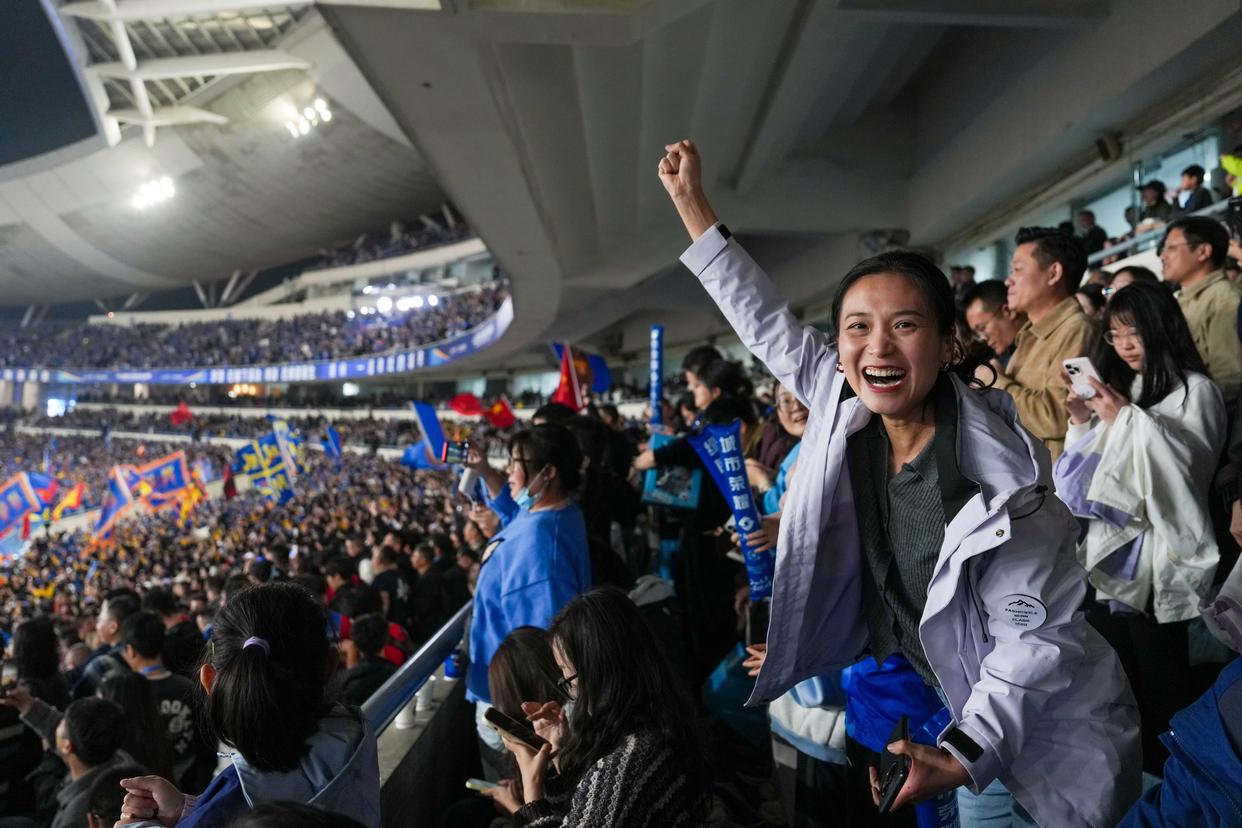 11月1日,一名球迷在看台为双方球队加油。新华社记者 李博 摄