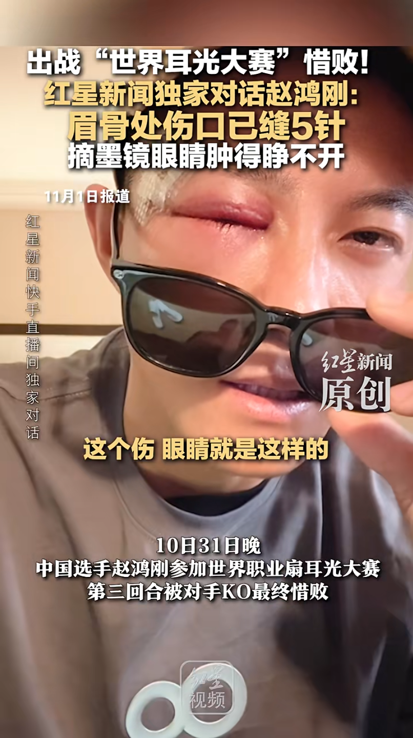 第一回合中赵鸿刚眉骨被打伤并出血,此后赵鸿刚全程带伤硬刚,第三回合不幸被KO,倒在擂台上。赛后红星新闻独家对话赵鸿刚,其表示眉骨处伤口已缝针,2日返回国内后将进一步检查。