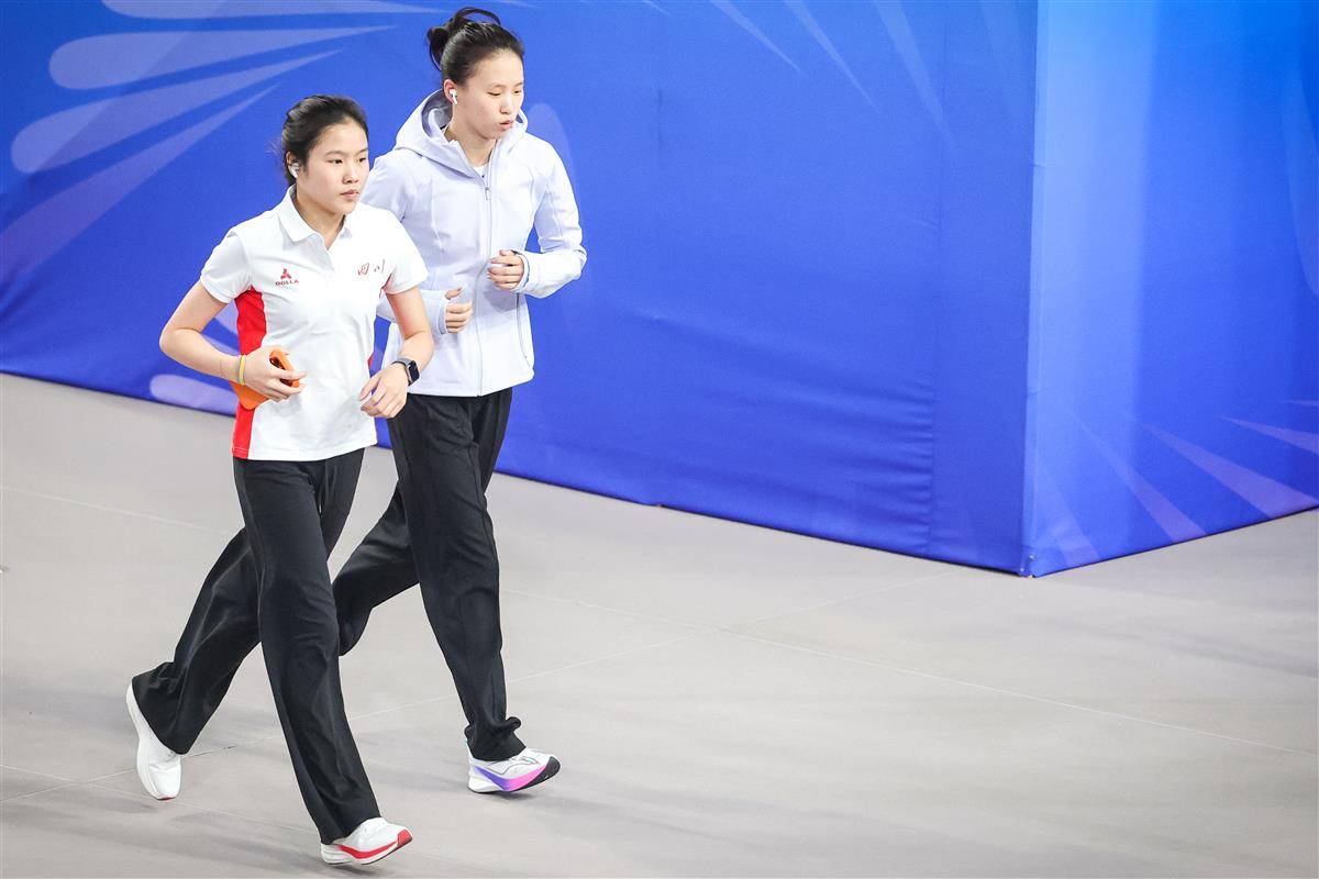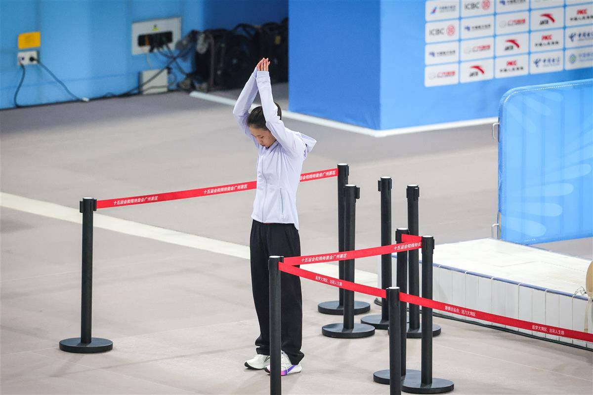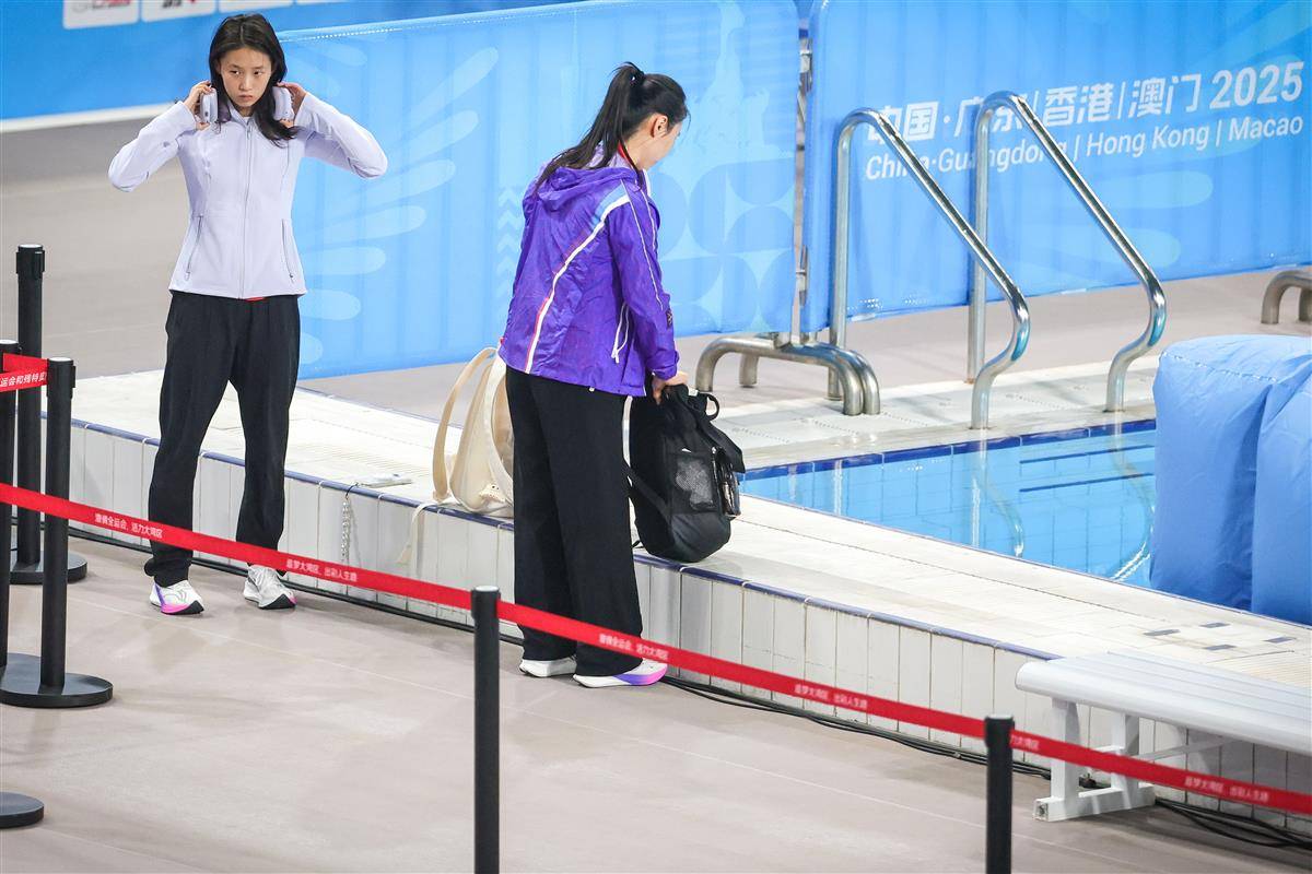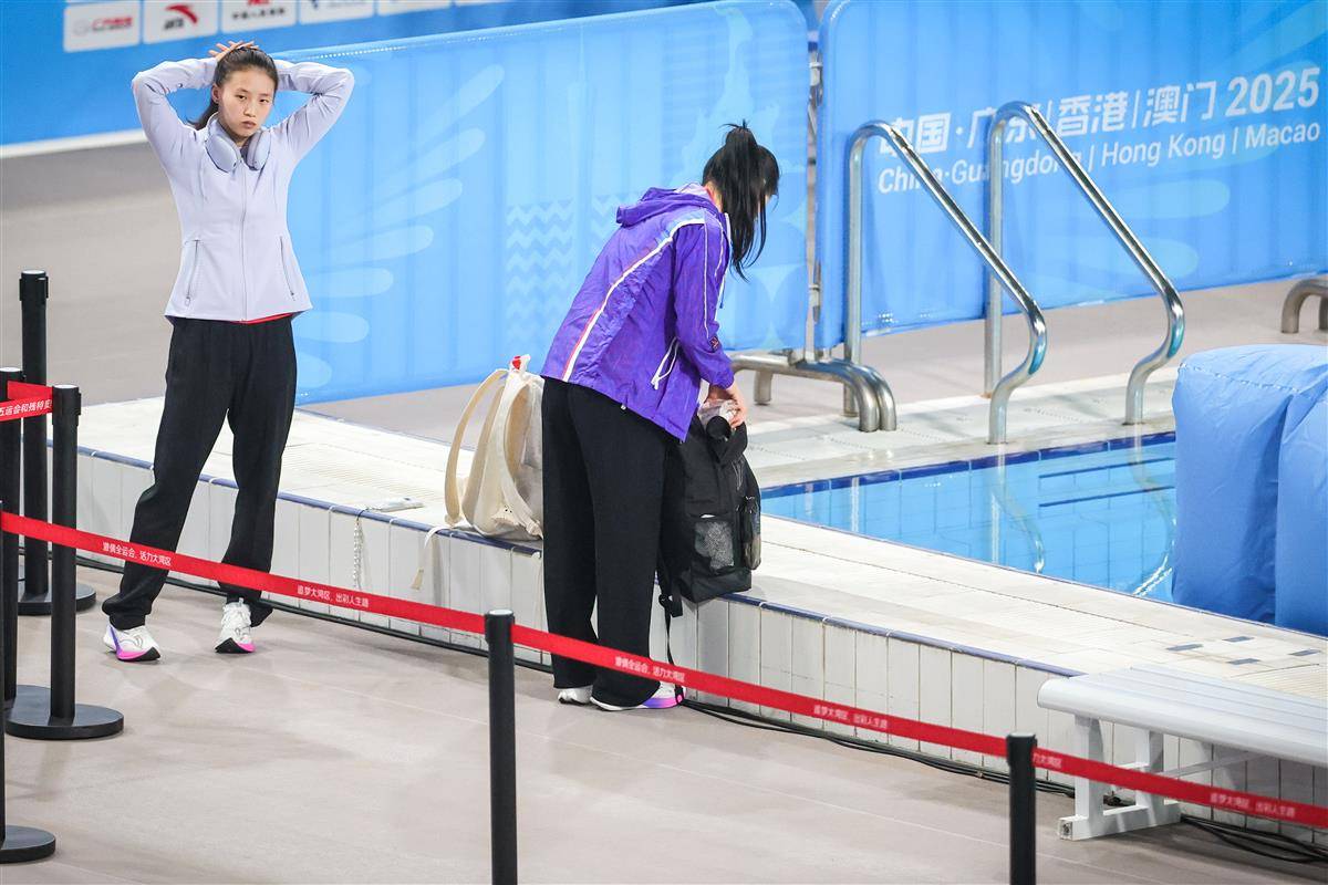 11月2日,广东奥体中心游泳馆,奥运冠军、上海名将陈芋汐亮相备战晚间进行的第十五届全运会跳水女团双人十米台比赛。(湖北日报全媒记者 时龚 摄)