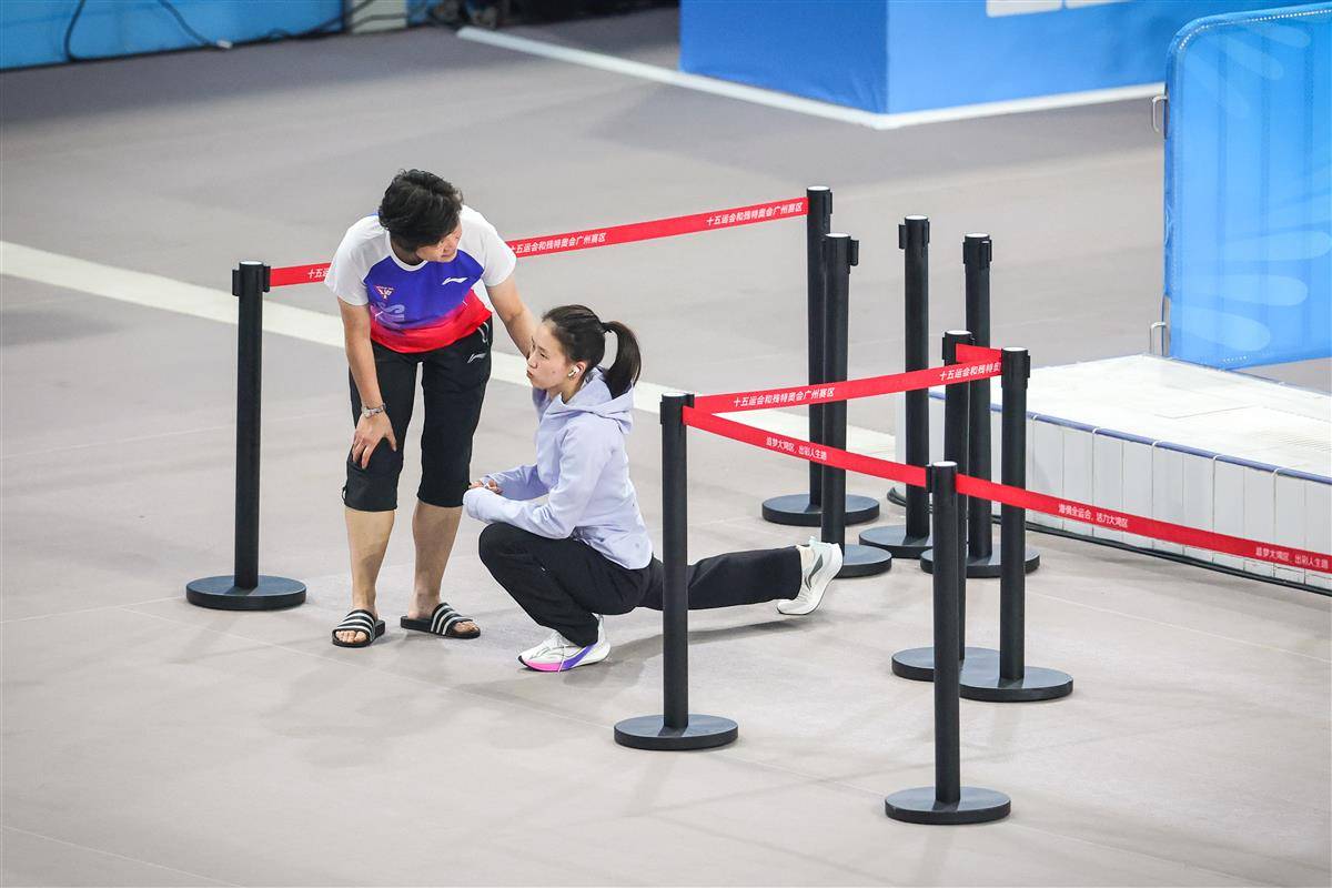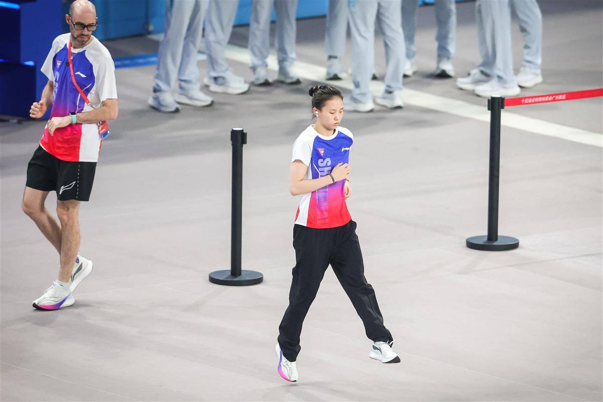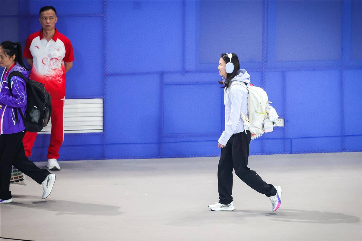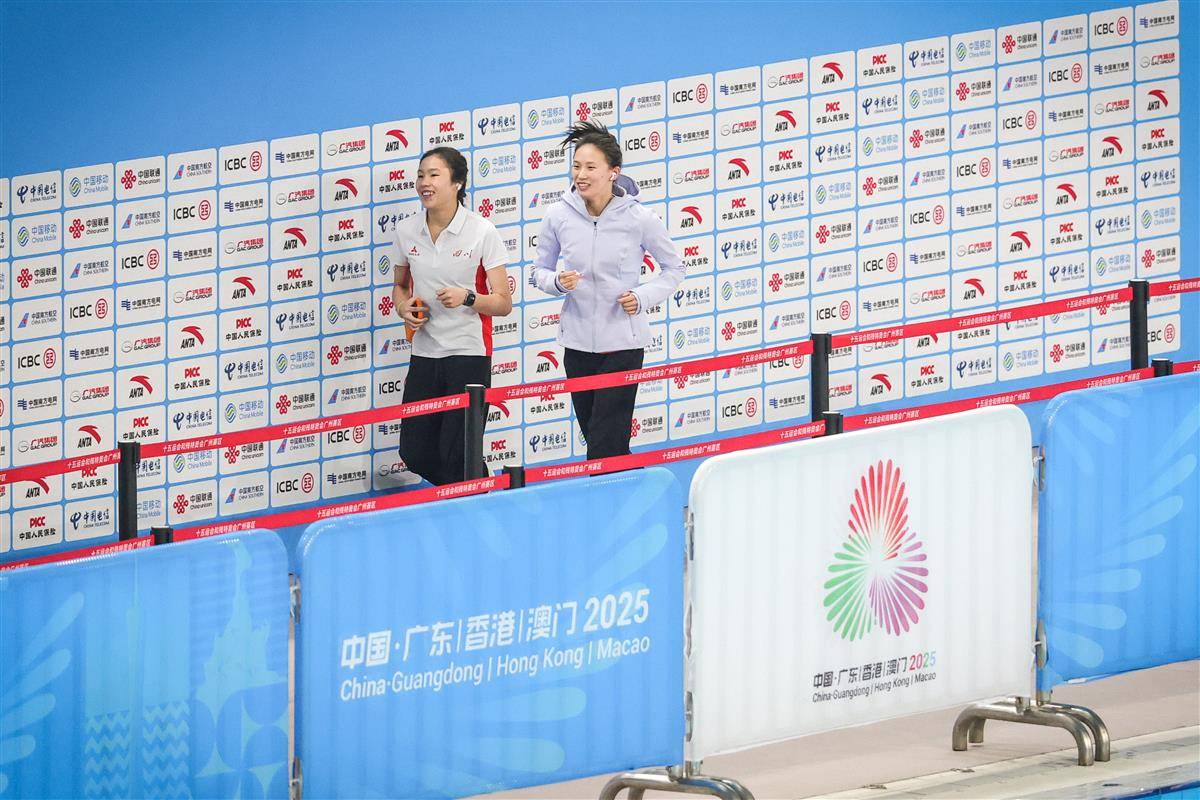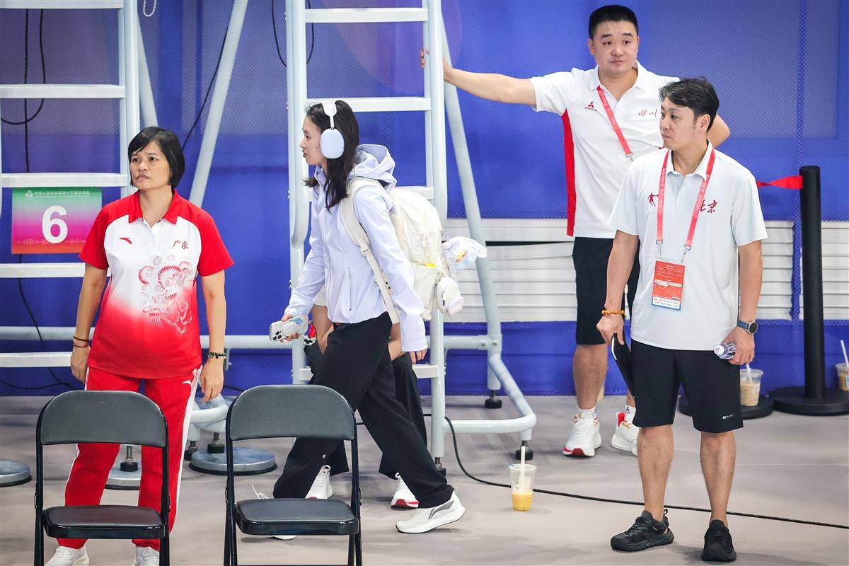 11月2日,广东奥体中心游泳馆,奥运冠军、上海名将陈芋汐亮相备战晚间进行的第十五届全运会跳水女团双人十米台比赛。(湖北日报全媒记者 时龚 摄)