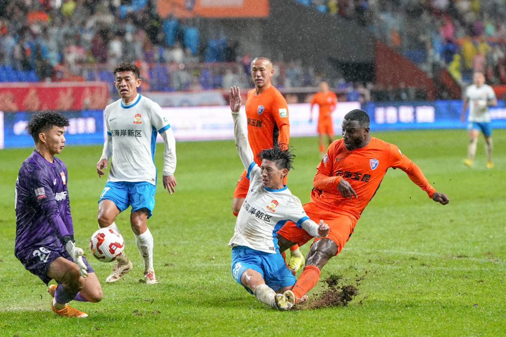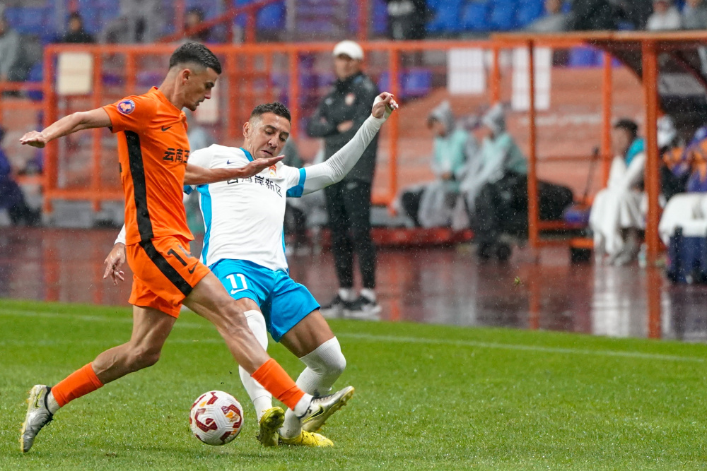 11月2日,云南玉昆队球员内内(左)与青岛西海岸队球员戴维森在比赛中拼抢。新华社记者 彭奕凯 摄