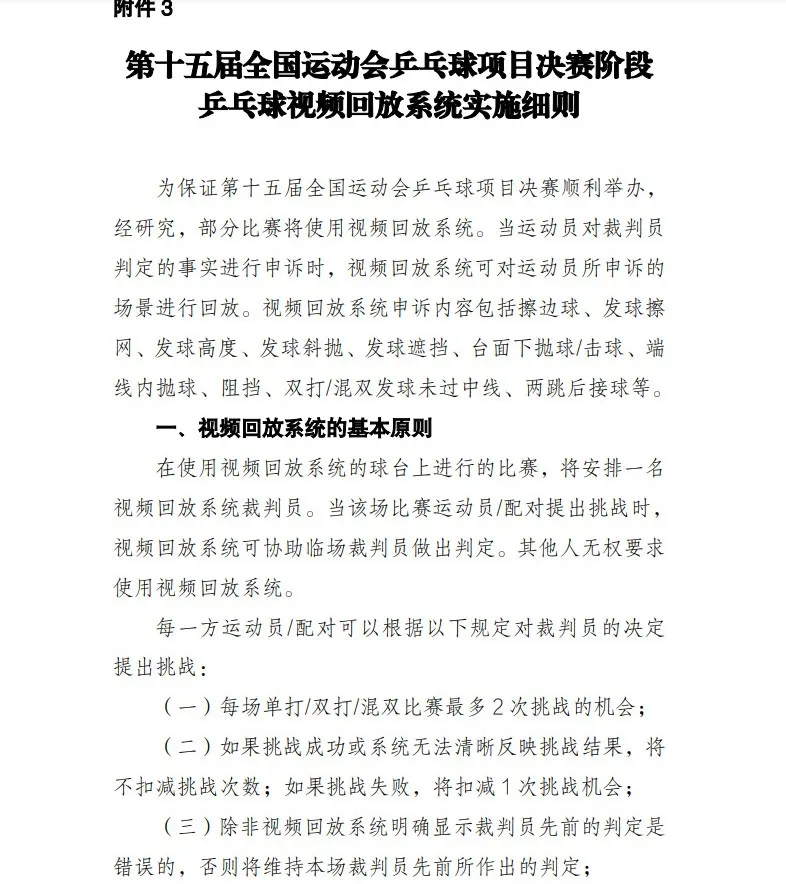 其中,《第十五届全国运动会乒乓球项目决赛阶段乒乓球视频回放系统实施细则》提到,部分比赛将使用视频回放系统,申诉内容包括擦边球、发球擦网、发球高度、发球斜抛、发球遮挡、台面下抛球/击球、端线内抛球、阻挡、双打/混双发球未过中线、两跳后接球等。