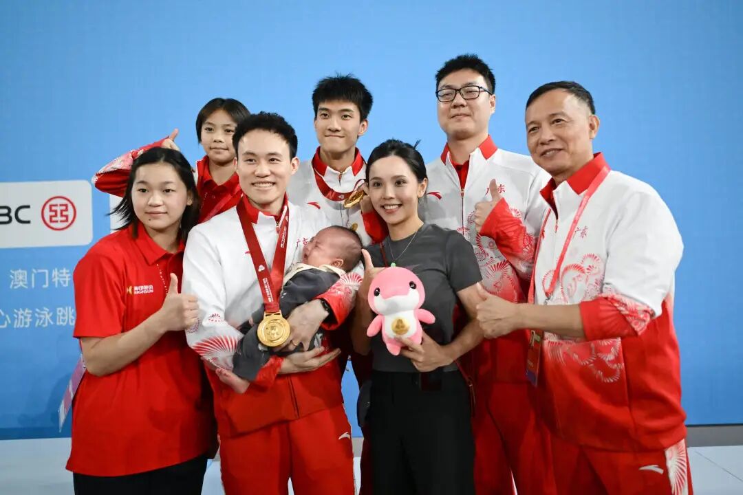 在广东队夺冠后,谢思埸的家人也来到现场庆祝(上图),全红婵也暖心抱着谢思埸的宝宝合影(下图)。
