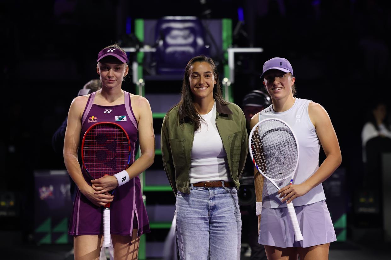 11月3日,莱巴金娜(左)、斯维亚特克(右)与前赛会冠军加西亚在赛前合影。新华社记者 罗晨 摄