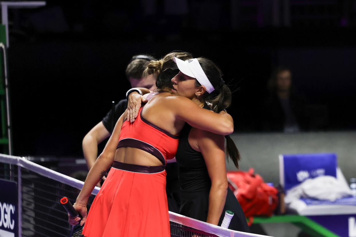 11月4日,萨巴伦卡(左)和佩古拉在赛后拥抱。新华社记者 罗晨 摄
