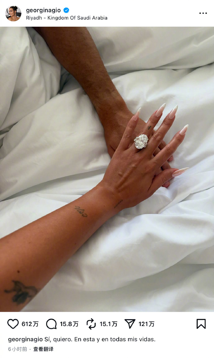 C罗克里斯蒂亚诺·罗纳尔多的女友乔治娜·罗德里格斯晒出订婚钻戒,“是的,我愿意。在此生以及我所有的生命中。”两人结束爱情长跑,订婚啦!