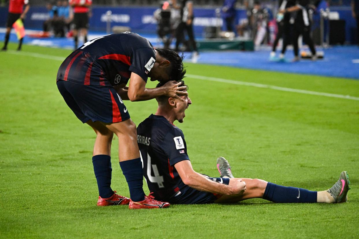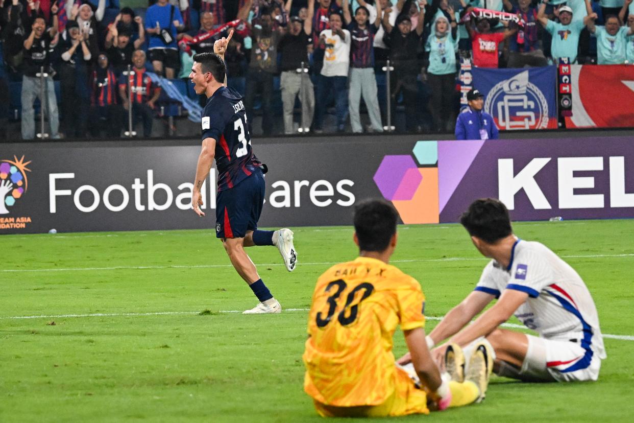 11月5日,柔佛新山队球员奥斯卡·阿里巴斯(右)在进球后庆祝得分。新华社记者 程一恒 摄