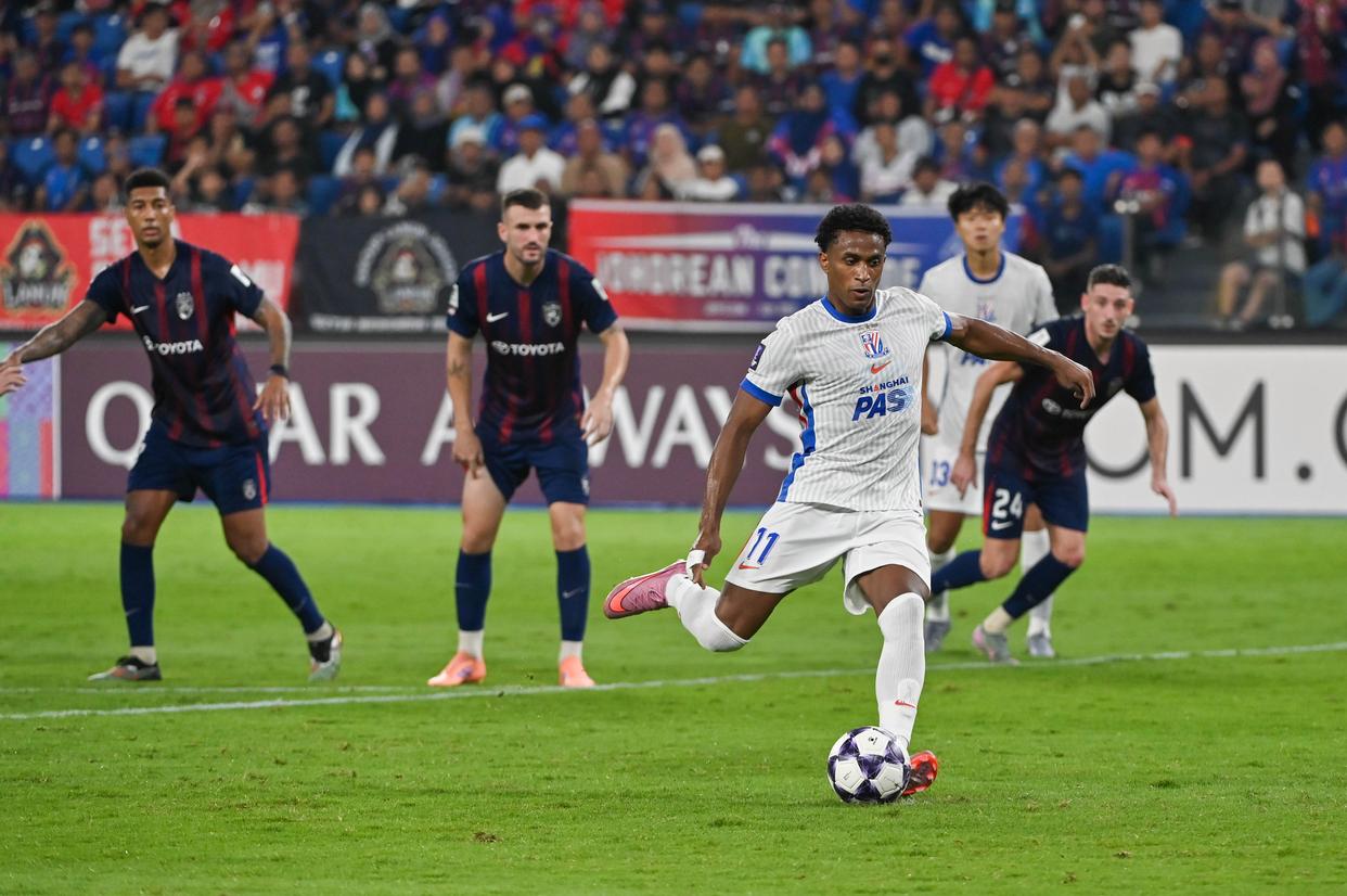 11月5日,上海申花队球员米内罗(前)主罚点球得分。新华社发(张纹综摄)