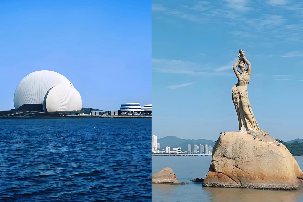 珠海大剧院(左)与珠海渔女雕像再往前