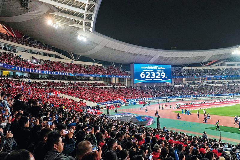 在江苏南京举行的 2025 江苏省城市足球联赛(“苏超”)决赛现场,大屏幕显示共有 62329 名观众观赛(2025 年11 月 1 日摄) 李博摄 / 本刊 创新·社会治理的效能公式