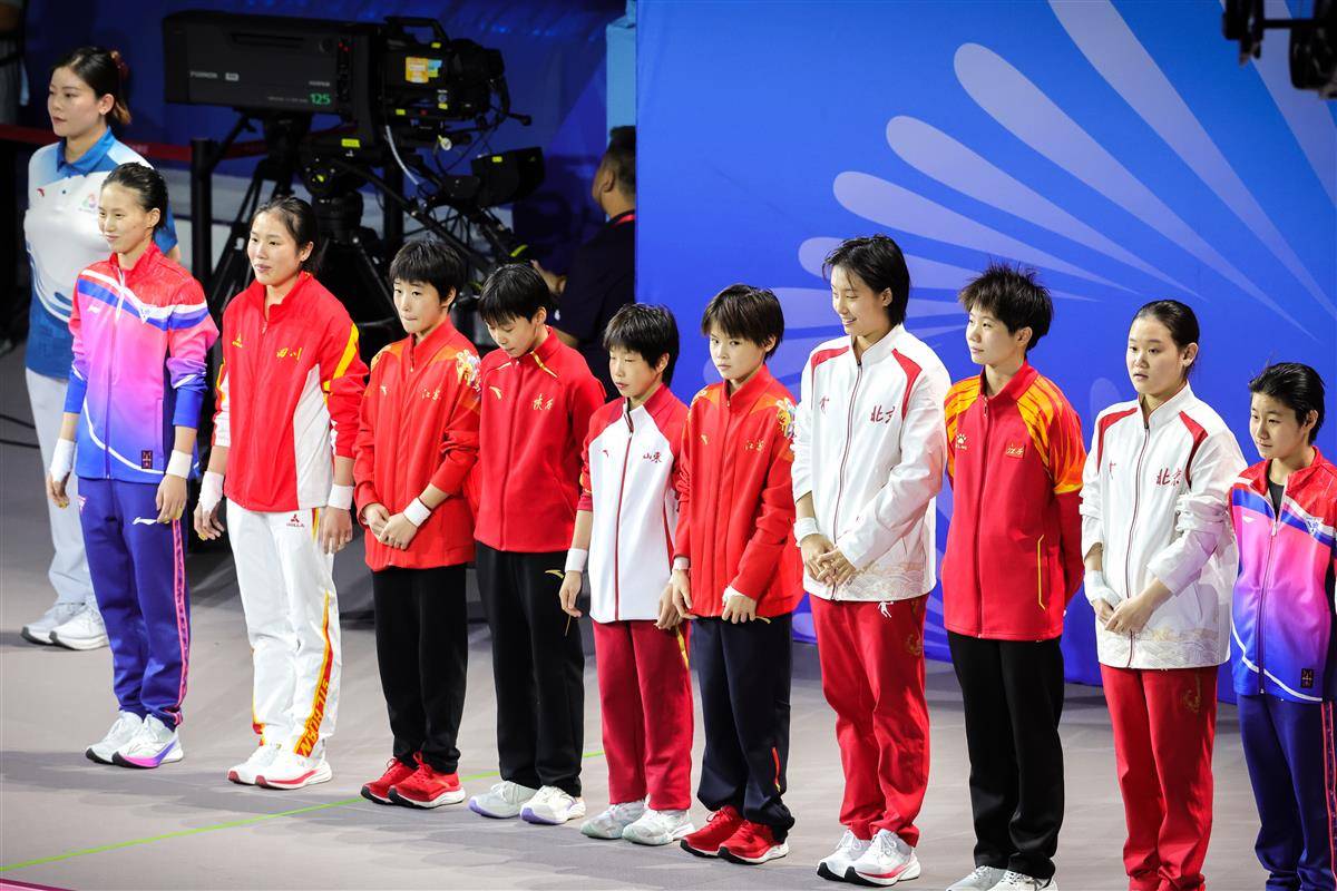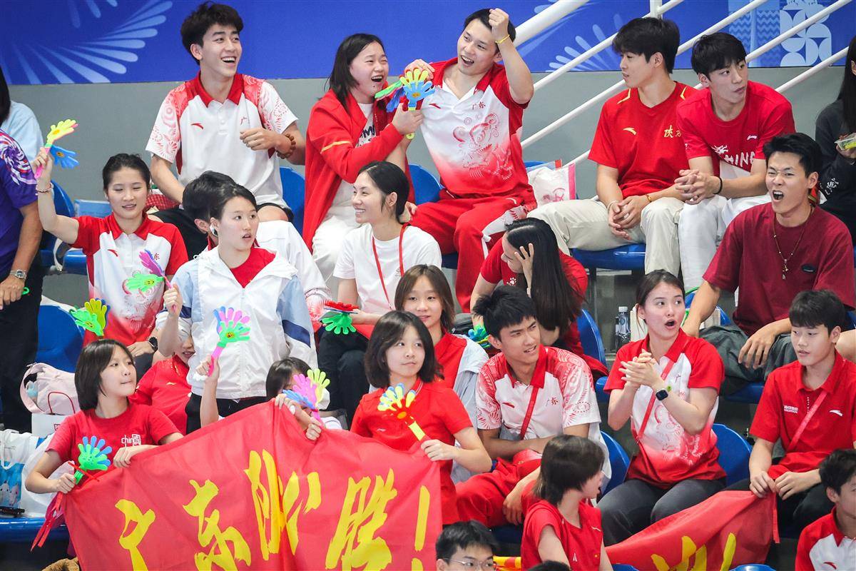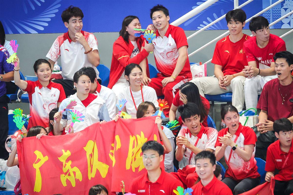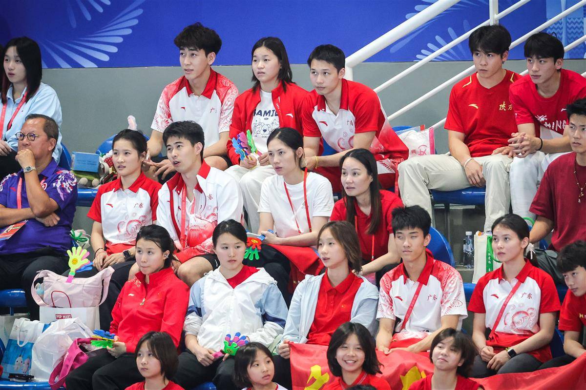 11月10日,广东奥体中心游泳馆,十五运会跳水女子十米台决赛,奥运冠军、上海选手陈芋汐夺冠,因伤缺席个人项目的奥运冠军全红婵看台上拉奥运冠军陈艾森一起为广东队队友助威。(湖北日报全媒记者 时龚 摄)