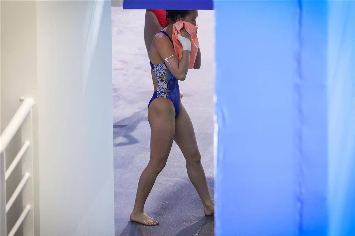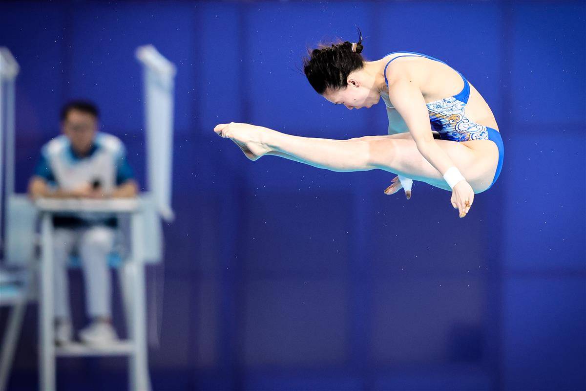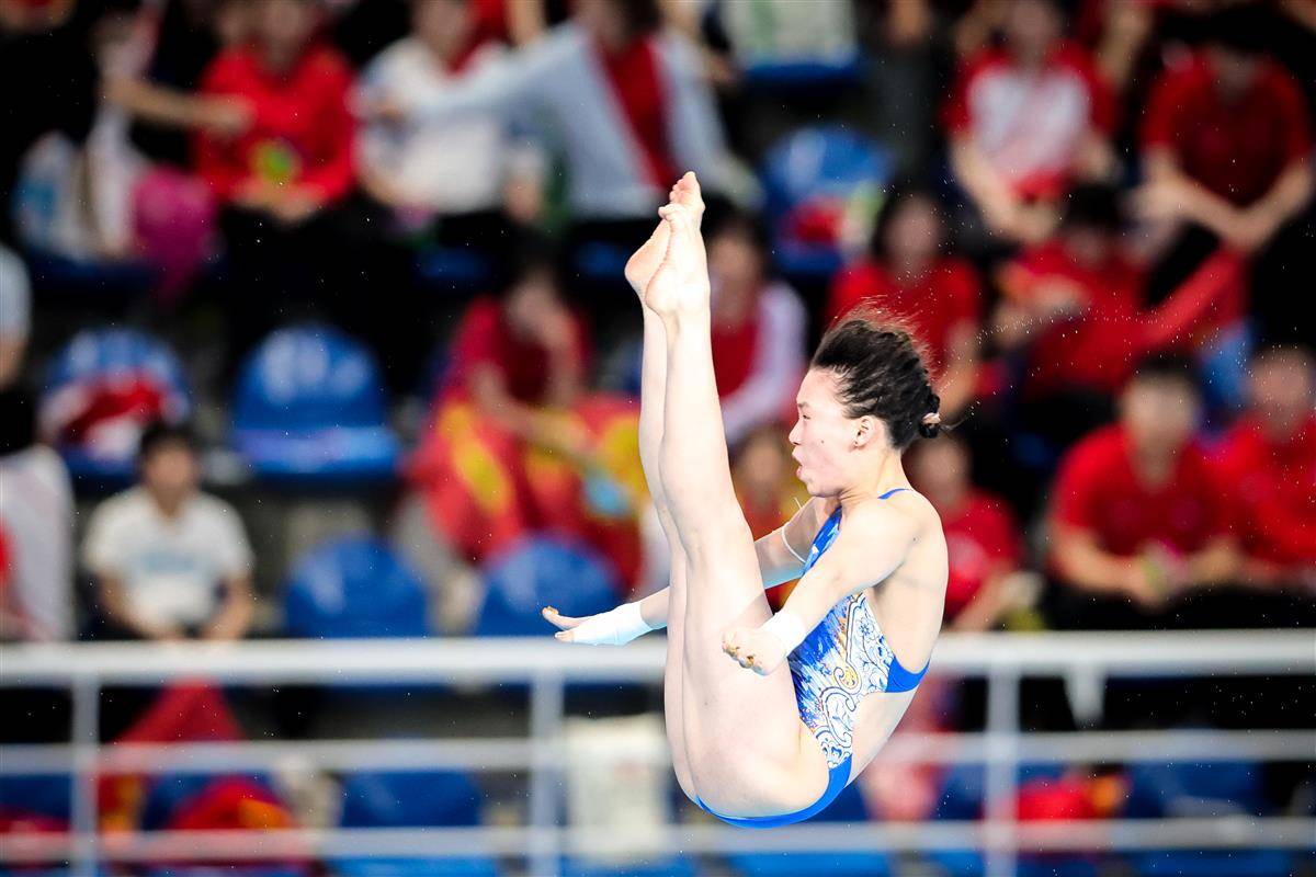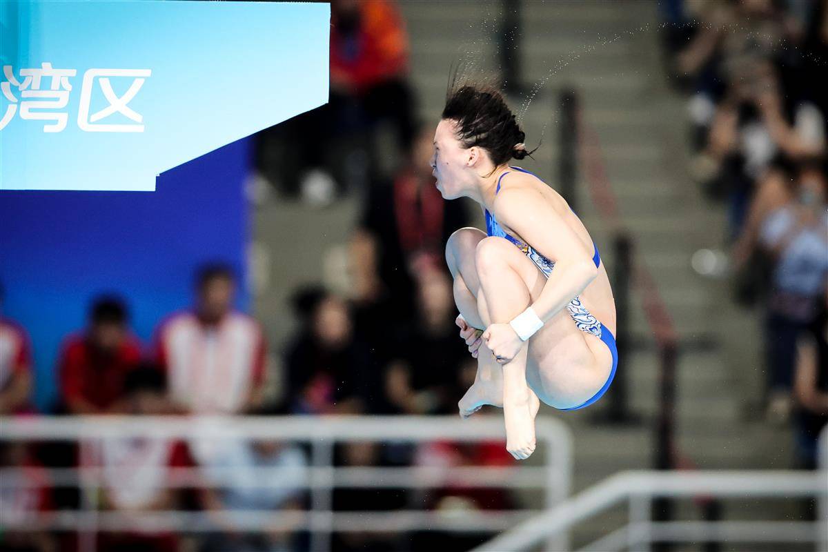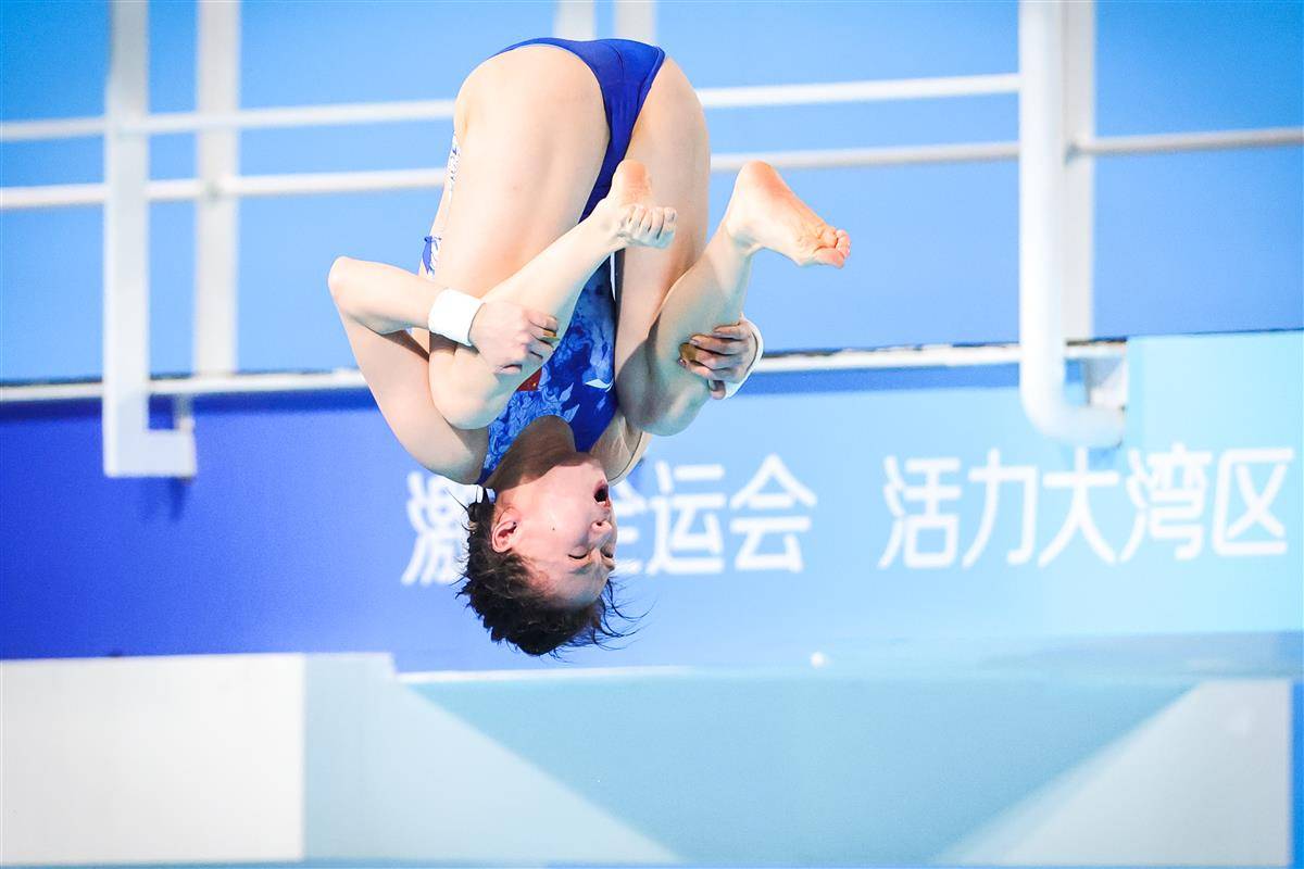 11月10日,广东奥体中心游泳馆,十五运会跳水女子十米台决赛,奥运冠军、上海选手陈芋汐夺冠,因伤缺席个人项目的奥运冠军全红婵看台上拉奥运冠军陈艾森一起为广东队队友助威。(湖北日报全媒记者 时龚 摄)