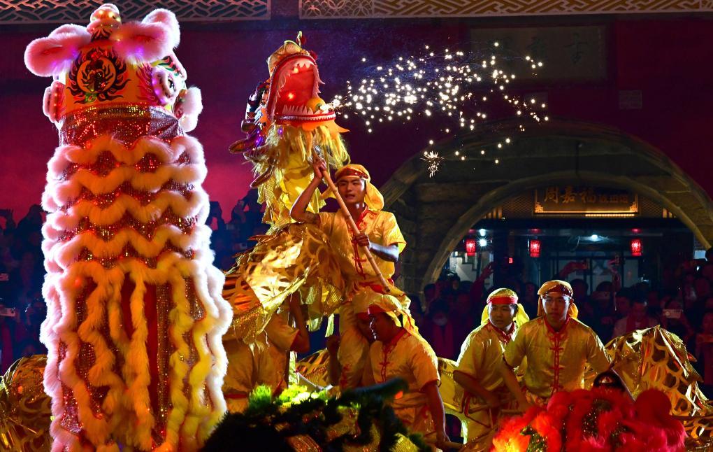 这是2025年1月29日在广东省佛山市祖庙黄飞鸿纪念馆前拍摄的醒狮巡游表演。新华社发(黄继明摄)