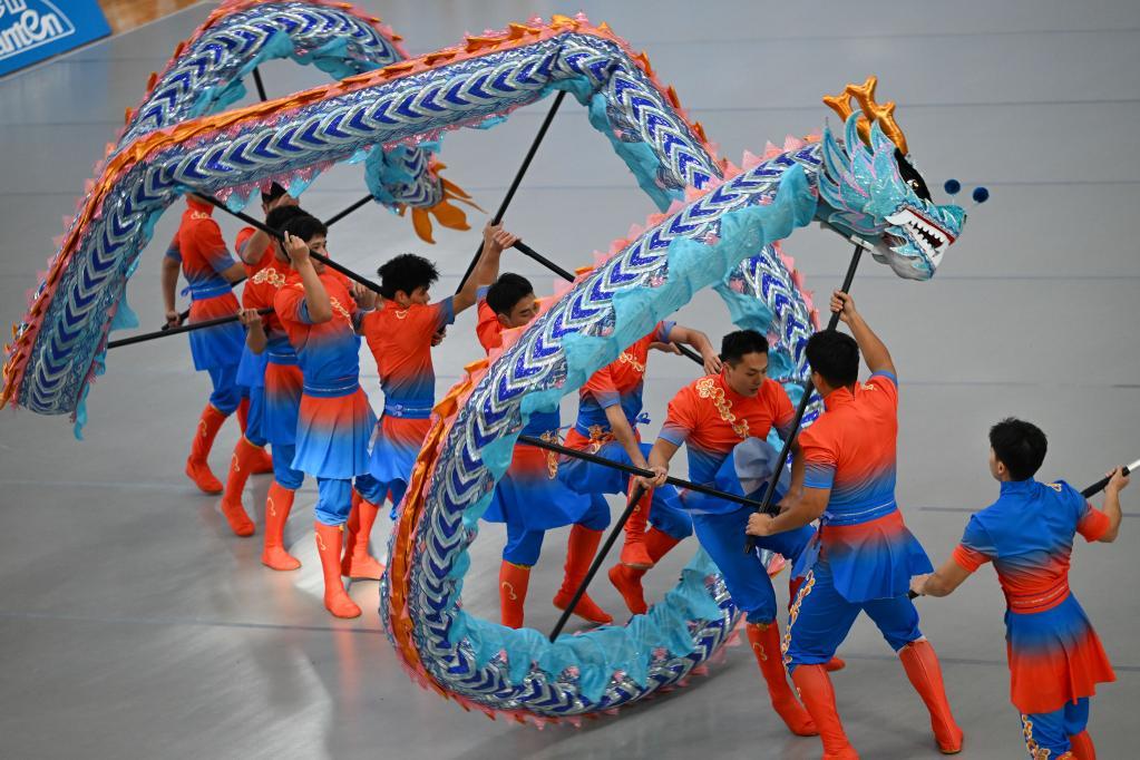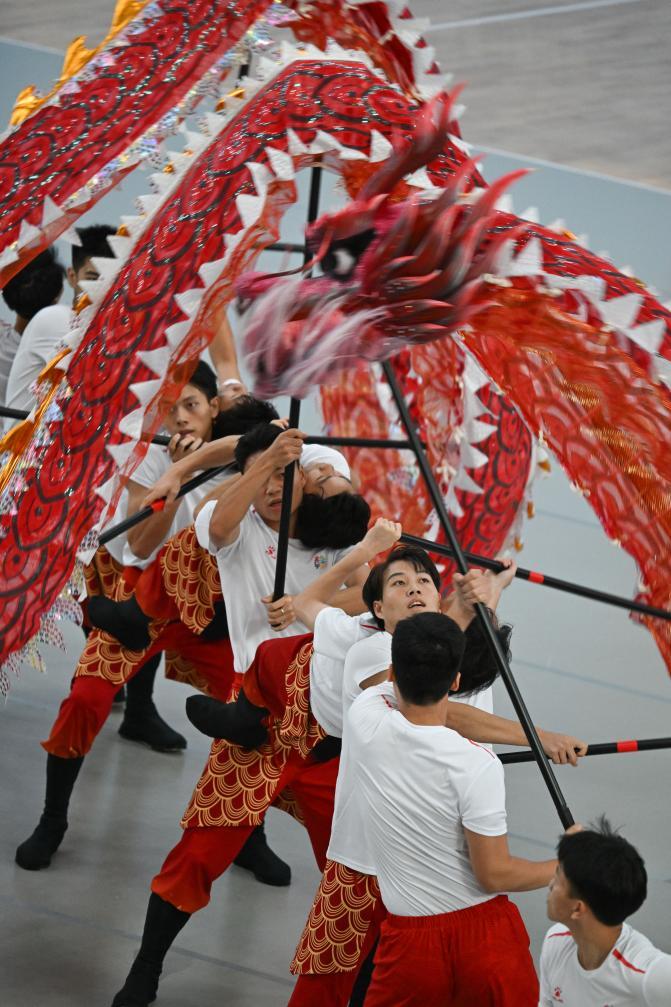 11月10日,香港队在广东省佛山市岭南明珠体育馆进行舞龙自选项目的适应场地训练。 新华社记者 邹竞一 摄
