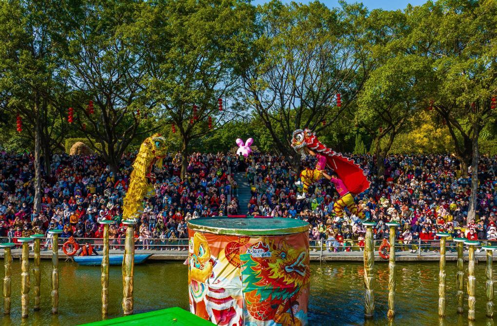 2023年1月24日,春节期间,在位于佛山市南海区西樵镇的西樵山天湖,水上高桩醒狮表演吸引众多游客观赏。新华社记者 刘大伟 摄