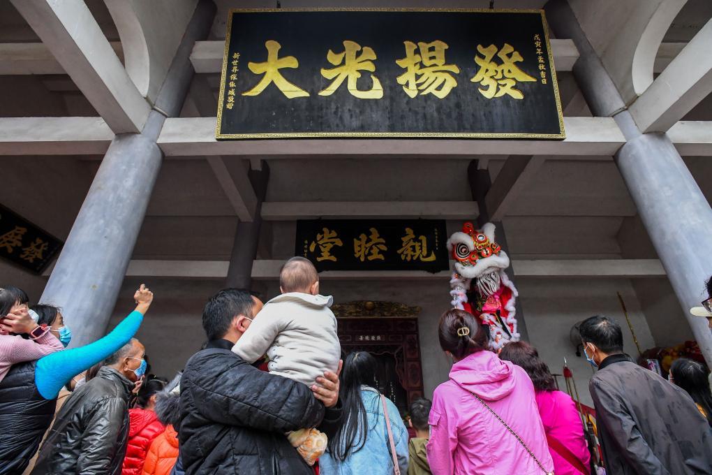 2023年1月12日,在佛山市南海区西樵黄氏宗祠,这里现在也是黄飞鸿狮艺武术馆,狮团为游客表演醒狮。新华社记者 刘大伟 摄