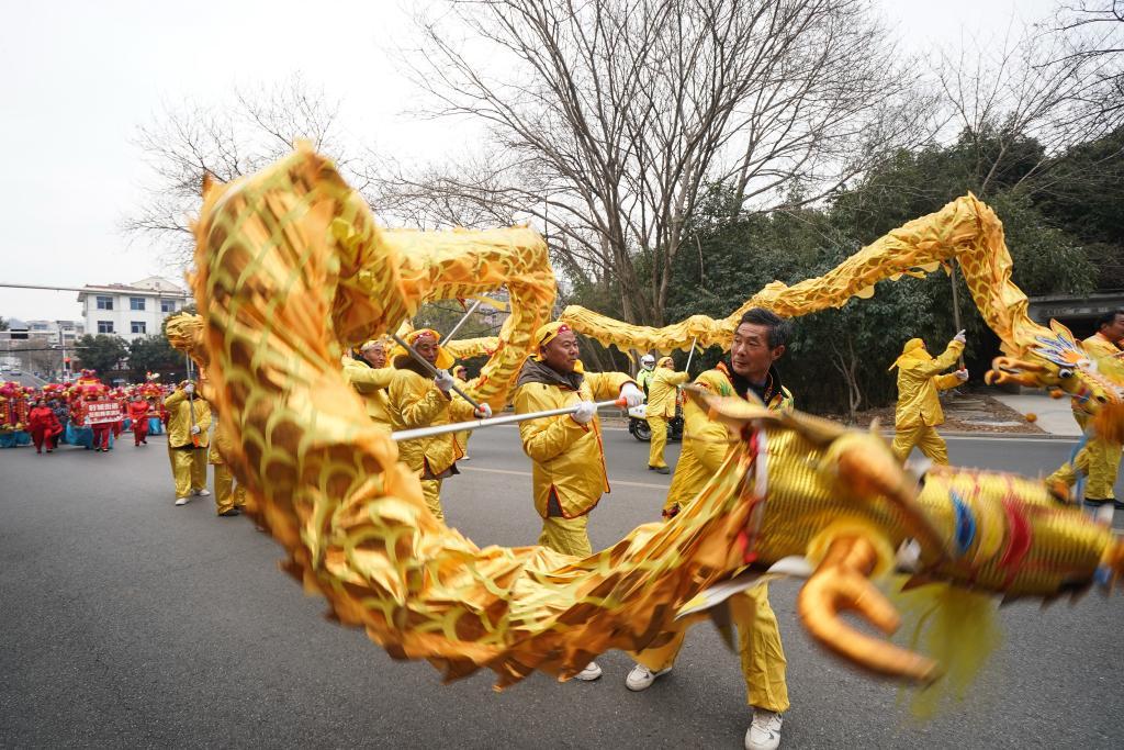2025年2月11日,巡游队伍在江苏省盱眙县城市道路上舞龙。新华社记者 季春鹏 摄