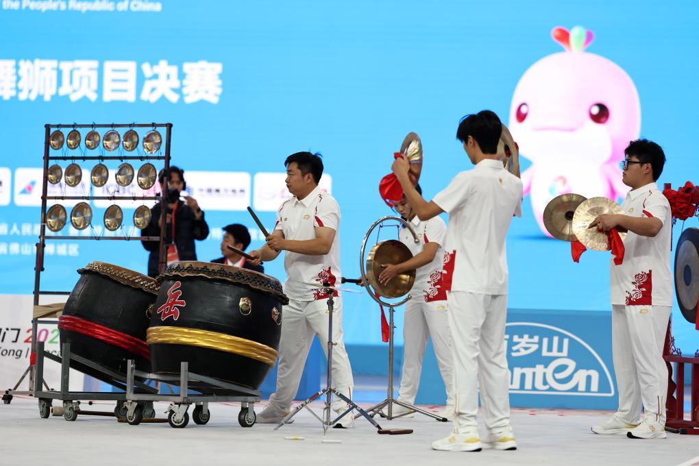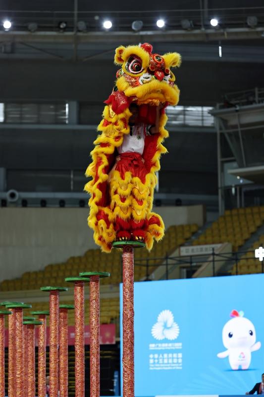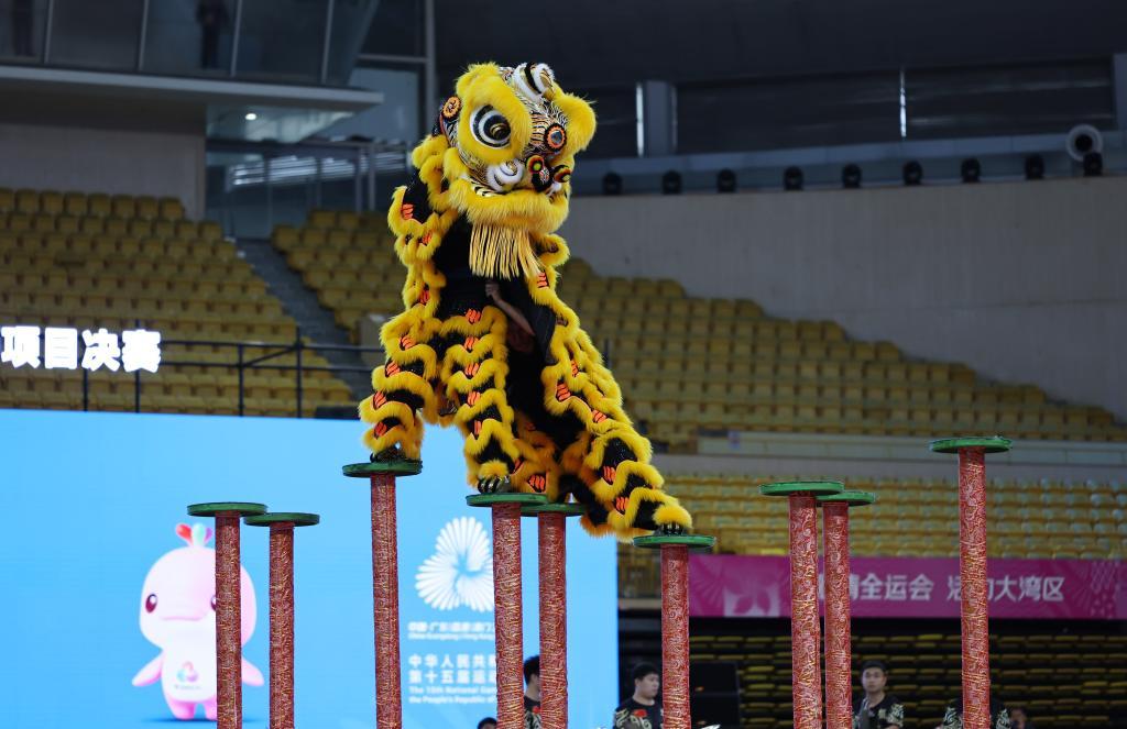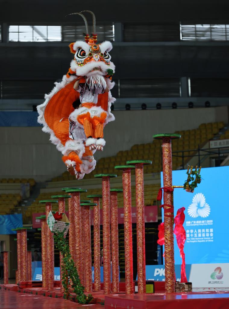 2025年11月11日,粤港澳队在第十五届全运会群众展演舞龙舞狮项目南狮自选决赛比赛中。新华社记者 王鹏 摄