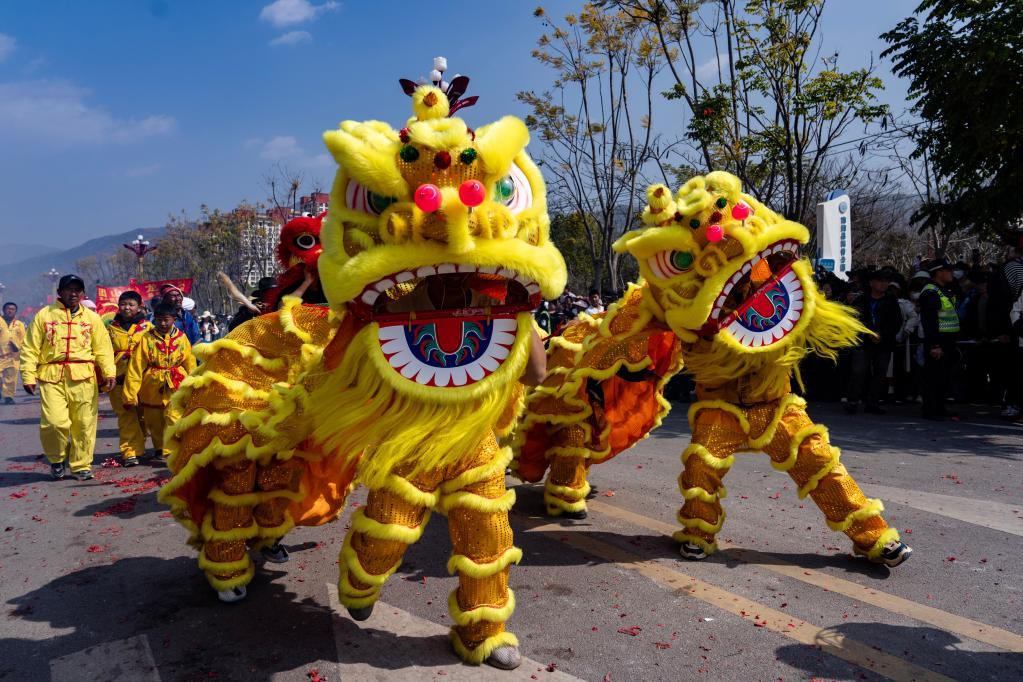 2025年2月6日,人们在云南省大理白族自治州南涧县龙灯会上表演舞狮。新华社记者 陈欣波 摄
