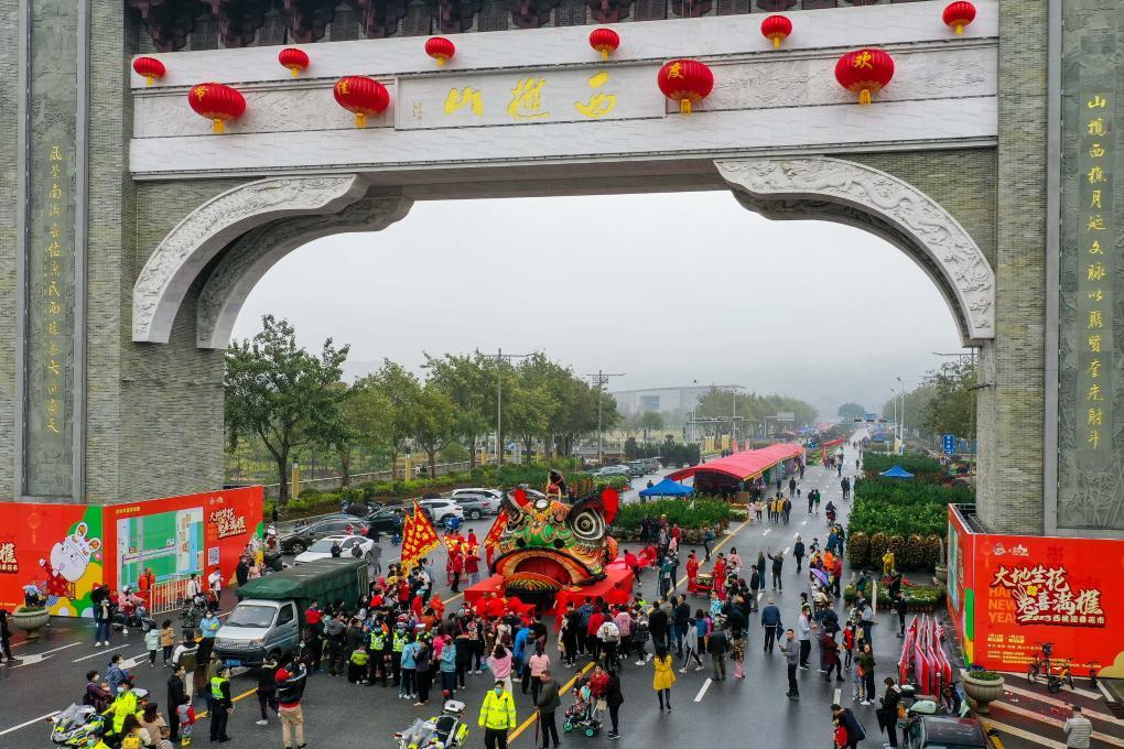 2023年1月12日,在佛山市南海区西樵镇西樵山牌坊,人们争相目睹高4.68米、宽4.5米的“狮王”狮头。新华社记者 刘大伟 摄