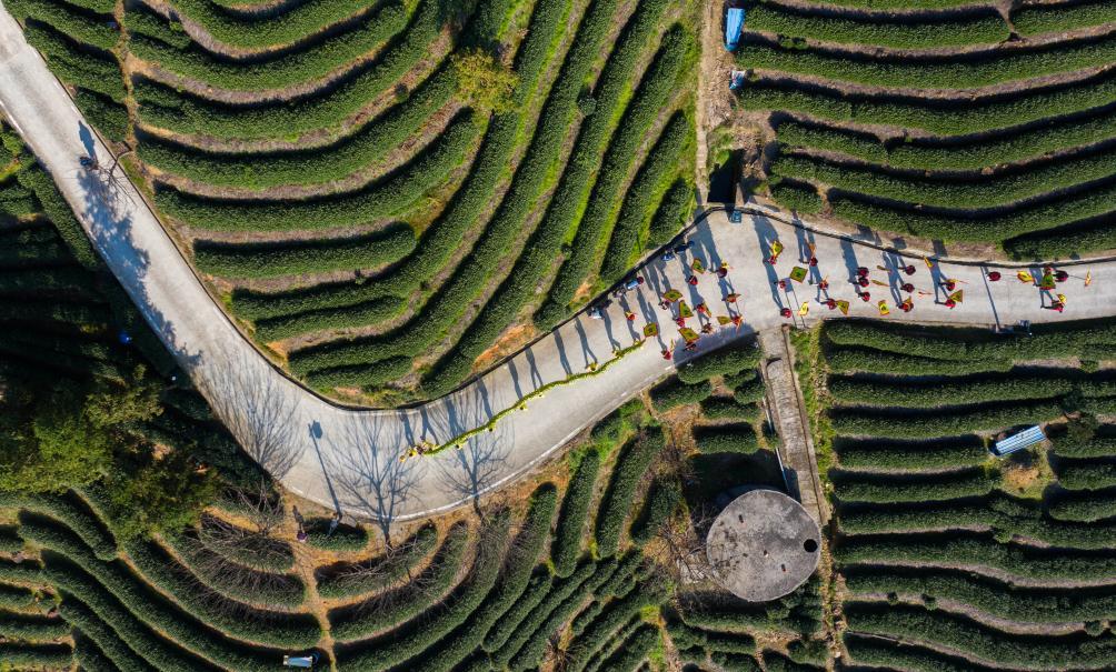 2025年3月18日,浙江省杭州市富阳区拔山村的舞龙队在茶农和游客的簇拥下走进万亩茶园。新华社记者 徐昱 摄