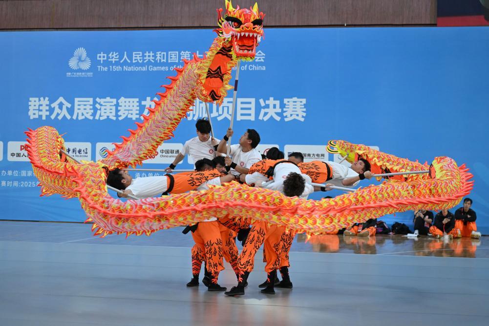 2025年11月11日,贵州队在第十五届全运会群众展演舞龙舞狮项目南狮自选决赛比赛中。新华社记者 王鹏 摄