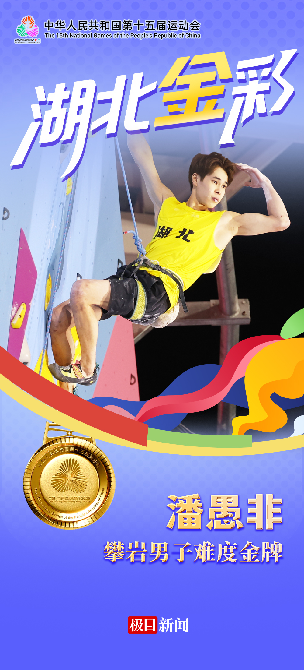 2025年11月13日晚,第十五届全国运动会攀岩项目男子难度决赛在广东广州大学城体育中心极限运动中心落幕。湖北队名将潘愚非凭借精准的线路判断、娴熟的攀爬技巧和强大的心理素质,成为全场唯一成功完攀的选手,强势摘得金牌,为湖北体育代表团斩获本届全运会第九枚金牌。
