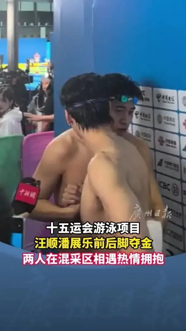 巧了,你也得了金牌!11月14日晚,十五运会游泳项目,汪顺、潘展乐前后脚夺金。赛后,两人在混采区相遇,热情握手拥抱。