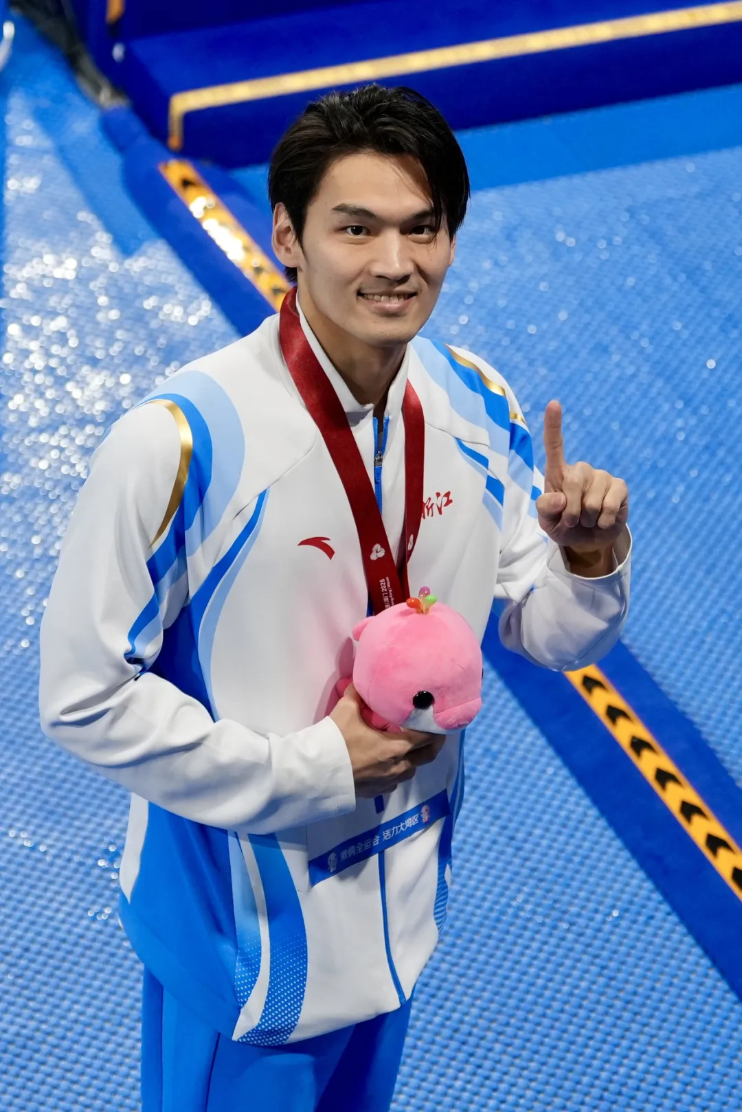 徐嘉余向观众比出“第一名”手势。通讯员 丁以婕摄
