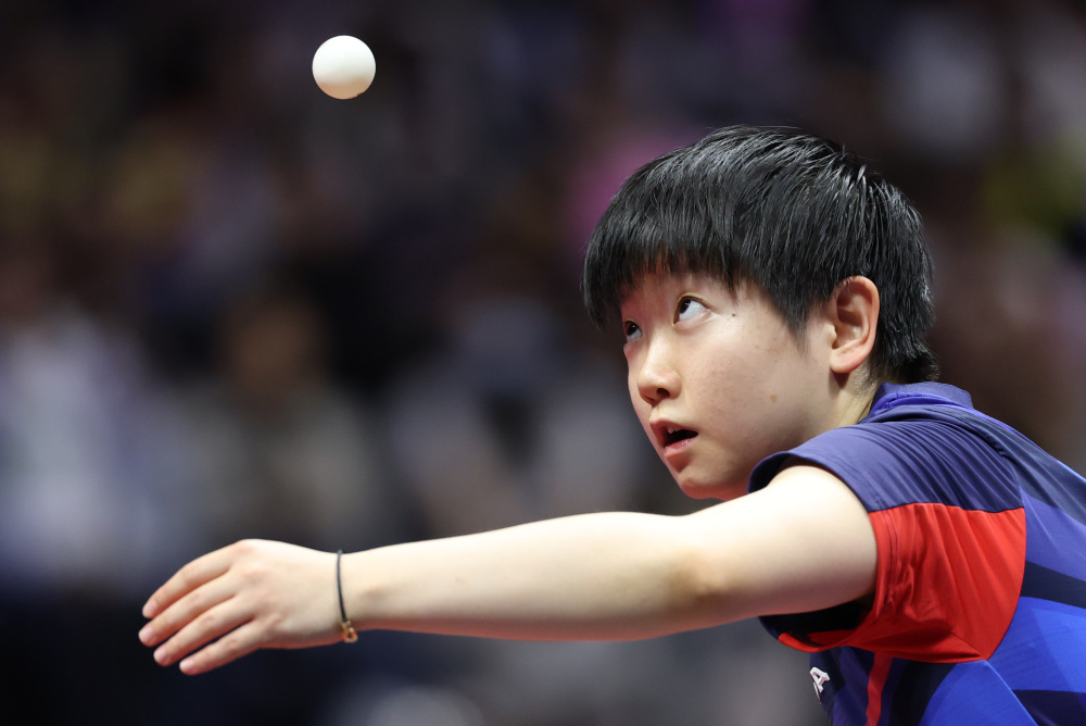11月16日,河北队选手孙颖莎在比赛中回球。新华社记者 陈斌 摄