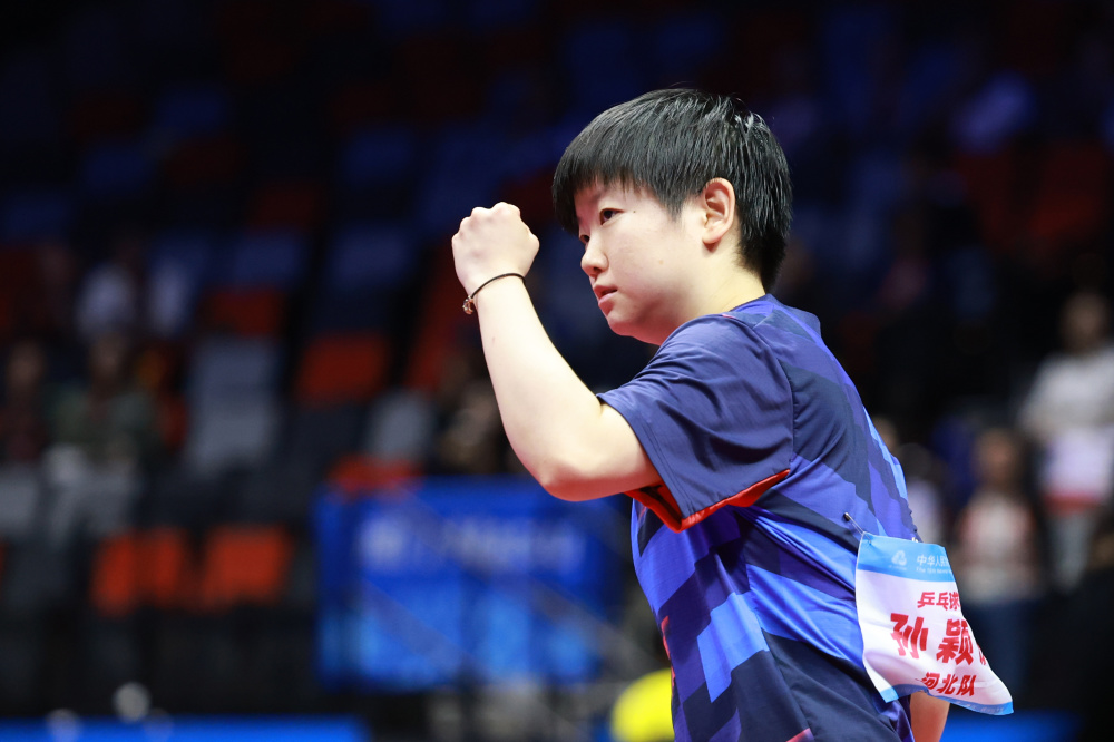 11月16日,河北队选手孙颖莎在比赛中庆祝。新华社记者 梁旭 摄