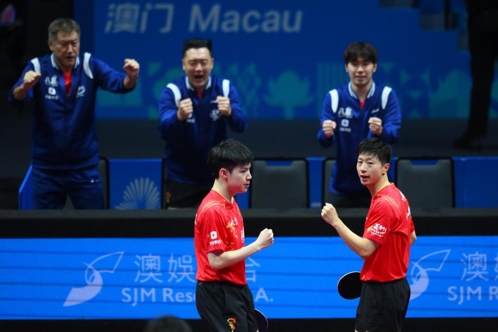 2025年11月18日,第十五届全国运动会乒乓球男子团体半决赛中,北京队组合马龙(右)/黄友政在男双比赛中庆祝。 新华社发(张金加摄)