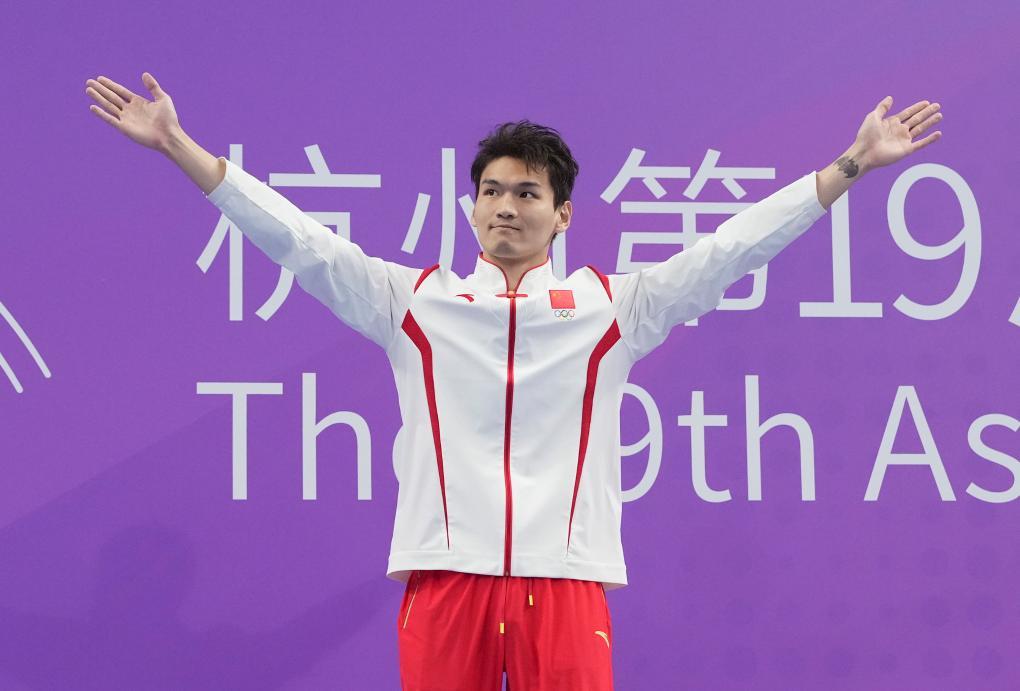 2023年9月29日,冠军中国选手徐嘉余在杭州亚运会男子200米仰泳决赛颁奖仪式上。新华社记者 杜宇 摄