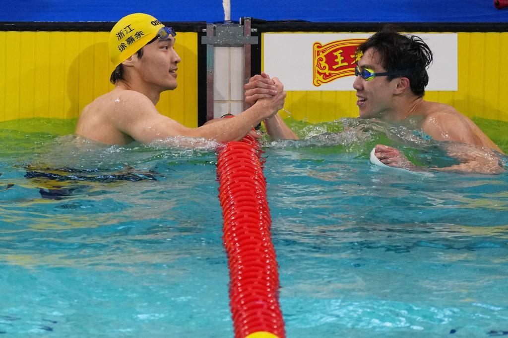 2025年11月17日,浙江队选手徐嘉余(左)和湖北队选手王梓成,在第十五届全国运动会游泳男子50米仰泳决赛后握手致意,他们分别获得冠军、亚军。 新华社记者 夏一方 摄