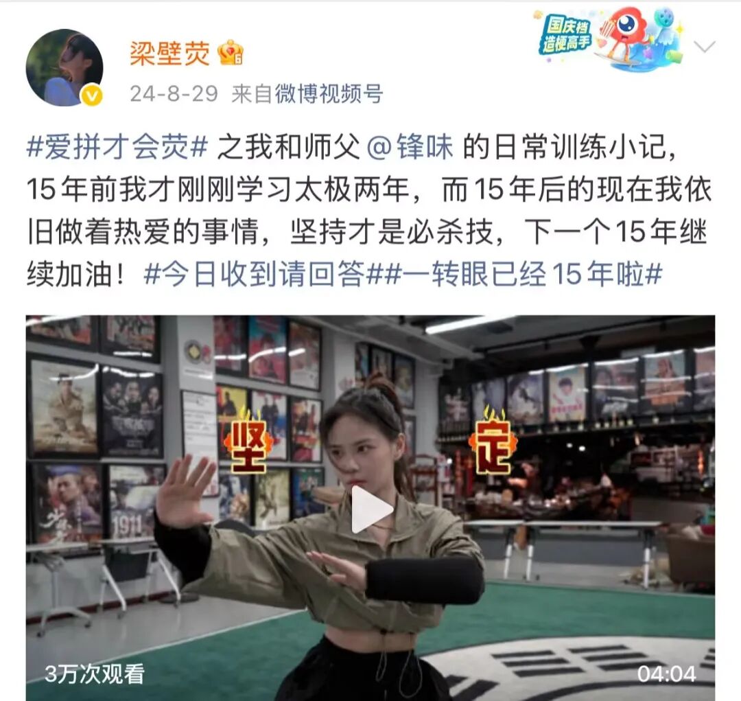 有业内人士评价梁壁荧天赋惊人,学太极拳好像“开了挂”,很快便收获丰硕成果。公开信息显示,青少年时期的梁壁荧在多个全国大赛中获得太极拳冠军,被誉为女子“太极拳王”。2020年,22岁的梁壁荧宣布退役,而就在一年前,她在世界武术锦标赛中勇夺女子太极拳世界冠军。