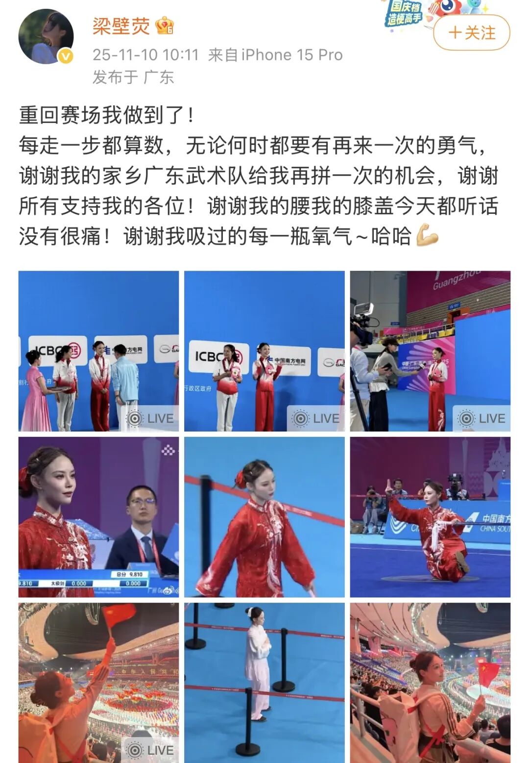 11月10日,梁壁荧在社交账号发文,感慨“重回赛场我做到了”。梁壁荧表示,人生走的每一步都算数,无论何时都要有再来一次的勇气,她还说,要谢谢自己的腰和膝盖“都很听话,没有很痛”,还要谢谢她吸过的每一瓶氧气。这句话貌似玩笑,背后却藏着一位运动员日复一日、饱含血泪的无言付出。