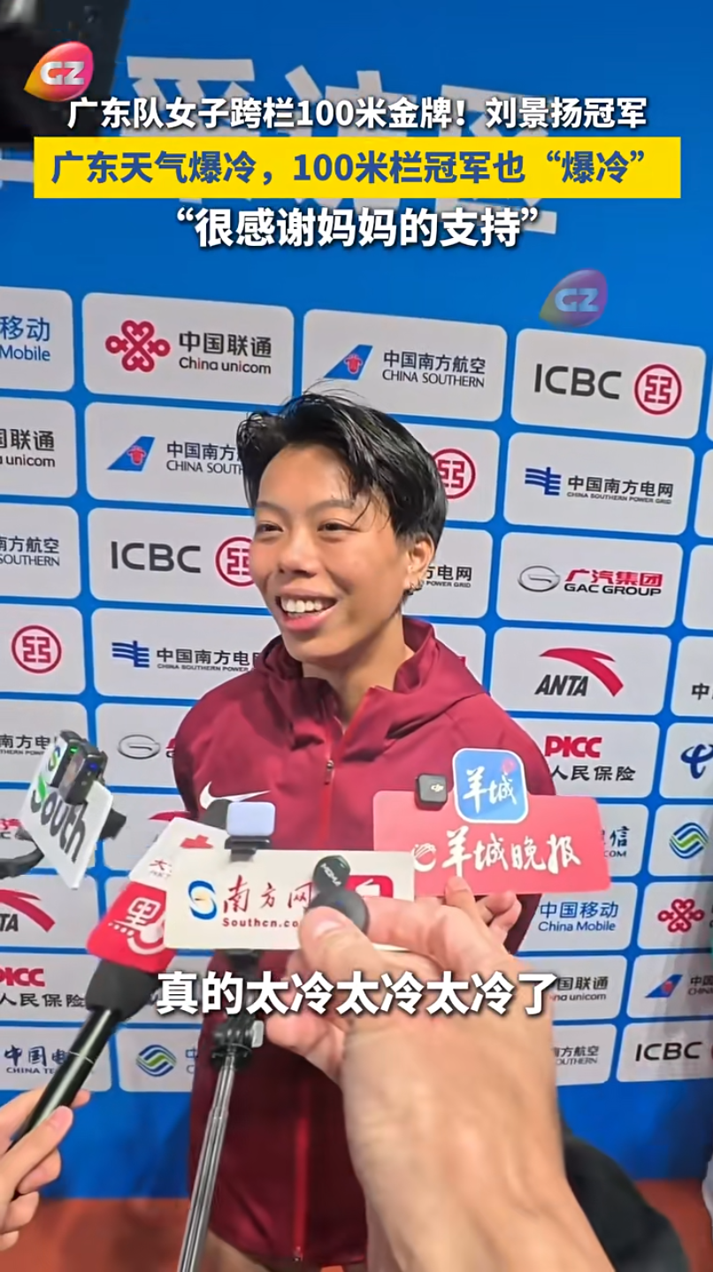 刘景扬在赛后采访中表示:广东天气爆冷,100米栏冠军也“爆冷”,从小学二年级到现在,很感谢妈妈这二十年的支持。