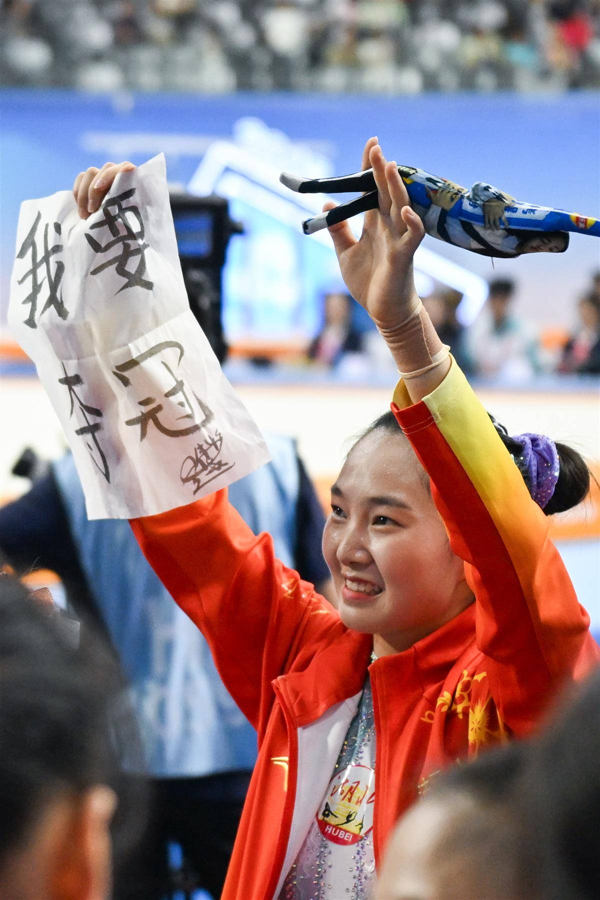 满场掌声如雷,她撕下胸前的“湖北”号码牌,高举在镜头前,比出“第一”的手势。在她的运动包里,“实至名归”“非你莫属”的祝福点亮了手机屏幕——屏保背景正是赛前她写下的“我要夺冠”海报。