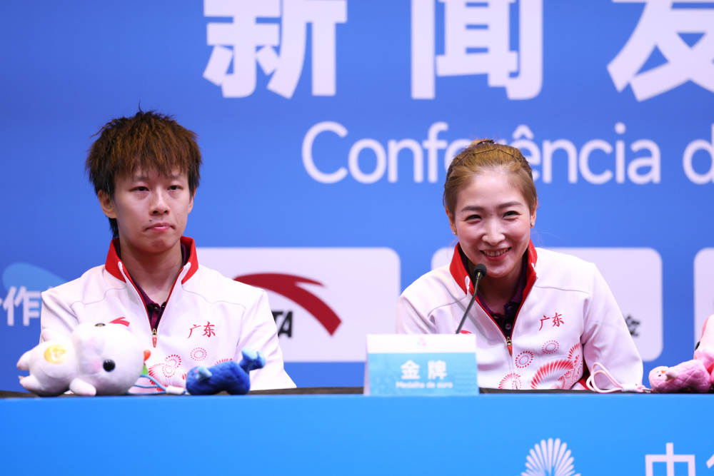 11月15日,获得全运会乒乓球混合双打冠军的广东队组合林高远(左)/刘诗雯在赛后新闻发布会上接受采访。新华社记者 梁旭 摄