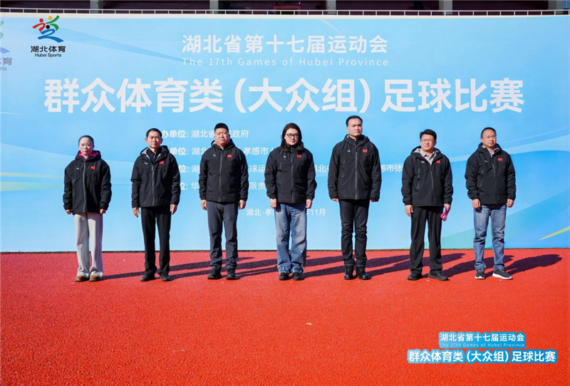11月19日,湖北省第十七届运动会群众体育类(大众组)足球比赛在孝感市体育中心体育场启幕,全省16个地市州的群众球员代表齐聚。开赛仪式后,黄冈队对阵武汉队的首场较量打响,荆楚足球盛会正式拉开帷幕。