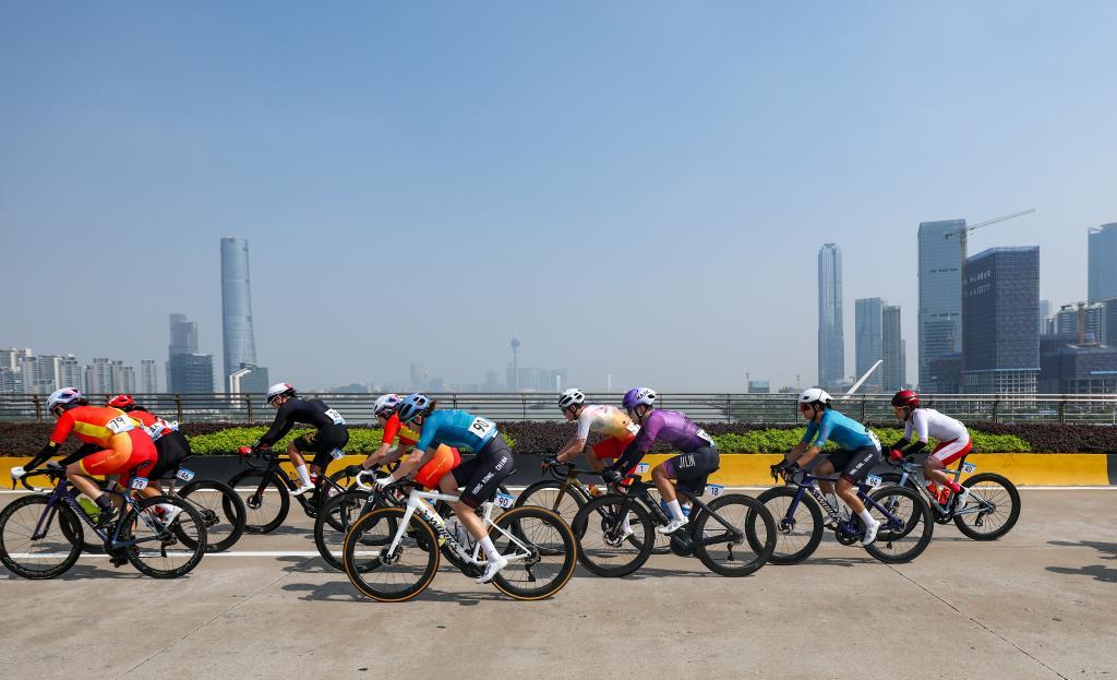 11月9日,参赛选手在比赛中。当日,第十五届全国运动会公路自行车女子个人赛决赛举行。新华社记者 毛思倩 摄