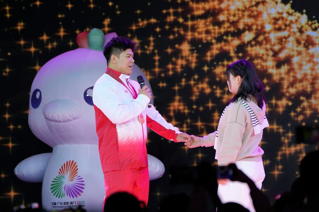 11月19日,天津队选手刘焕华(左)在赛后向女友求婚。新华社记者 杨晨光 摄