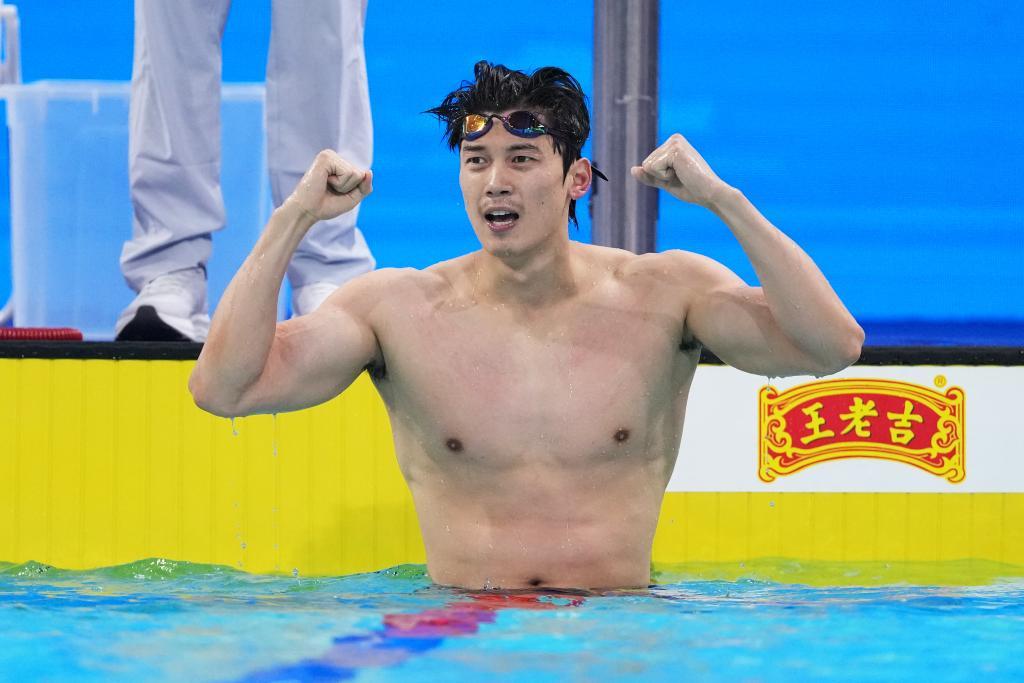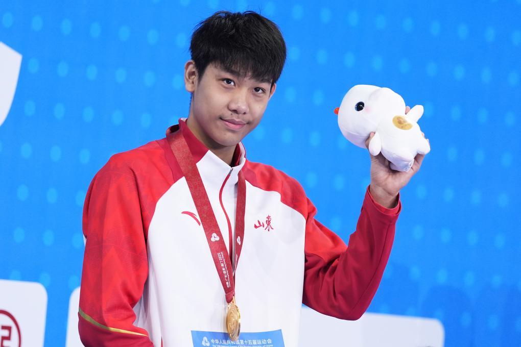 11月17日,第十五届全国运动会游泳男子400米个人混合泳决赛在广东省深圳市举行,浙江队选手汪顺在比赛后庆祝夺冠。新华社记者 薛宇舸 摄