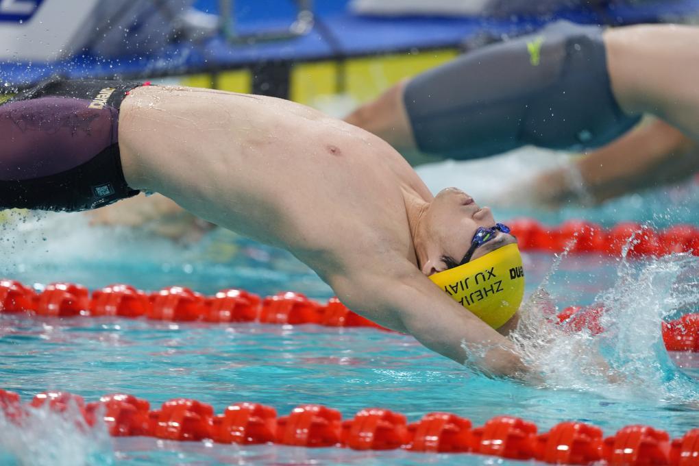 11月17日,第十五届全国运动会游泳男子50米仰泳决赛在广东省深圳市举行,浙江队选手徐嘉余在比赛中出发。新华社记者 杜宇 摄