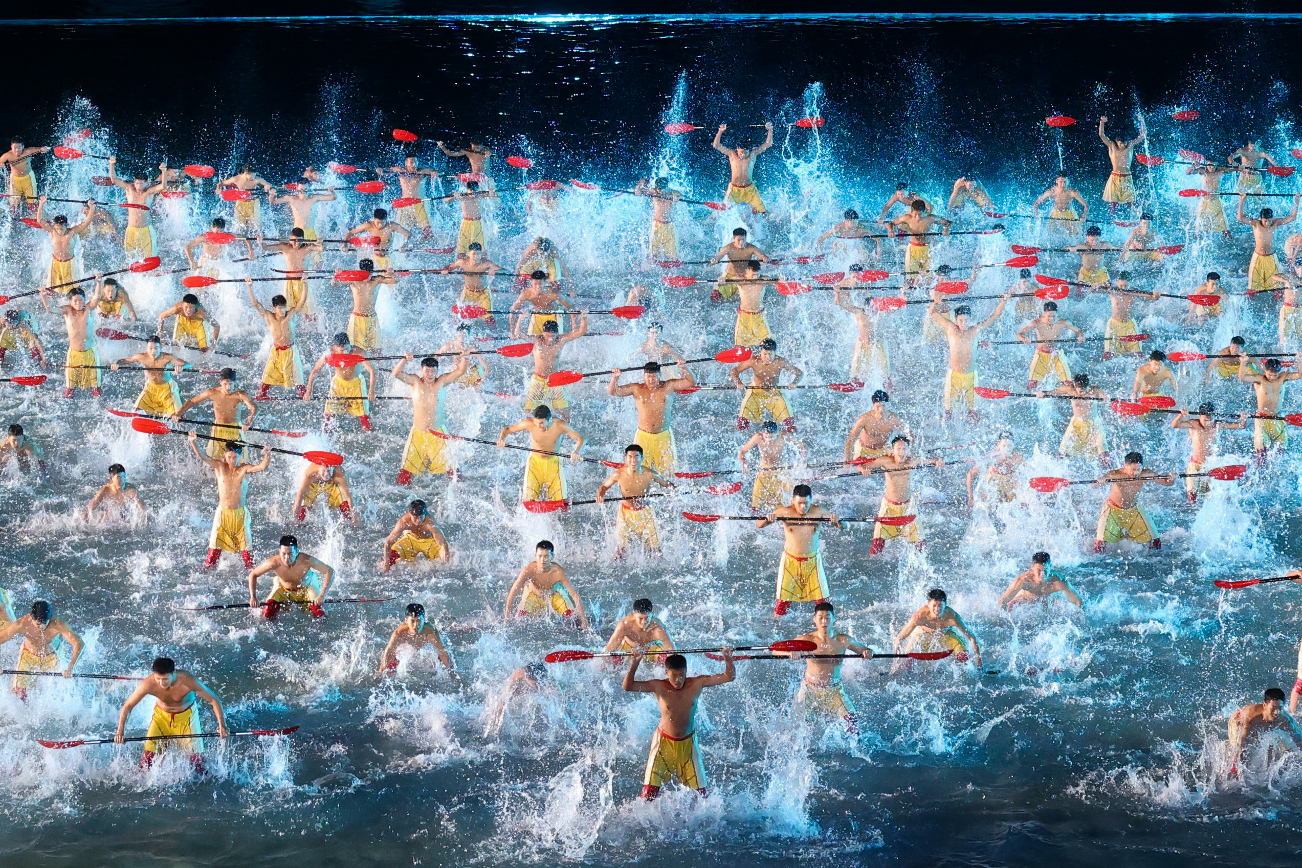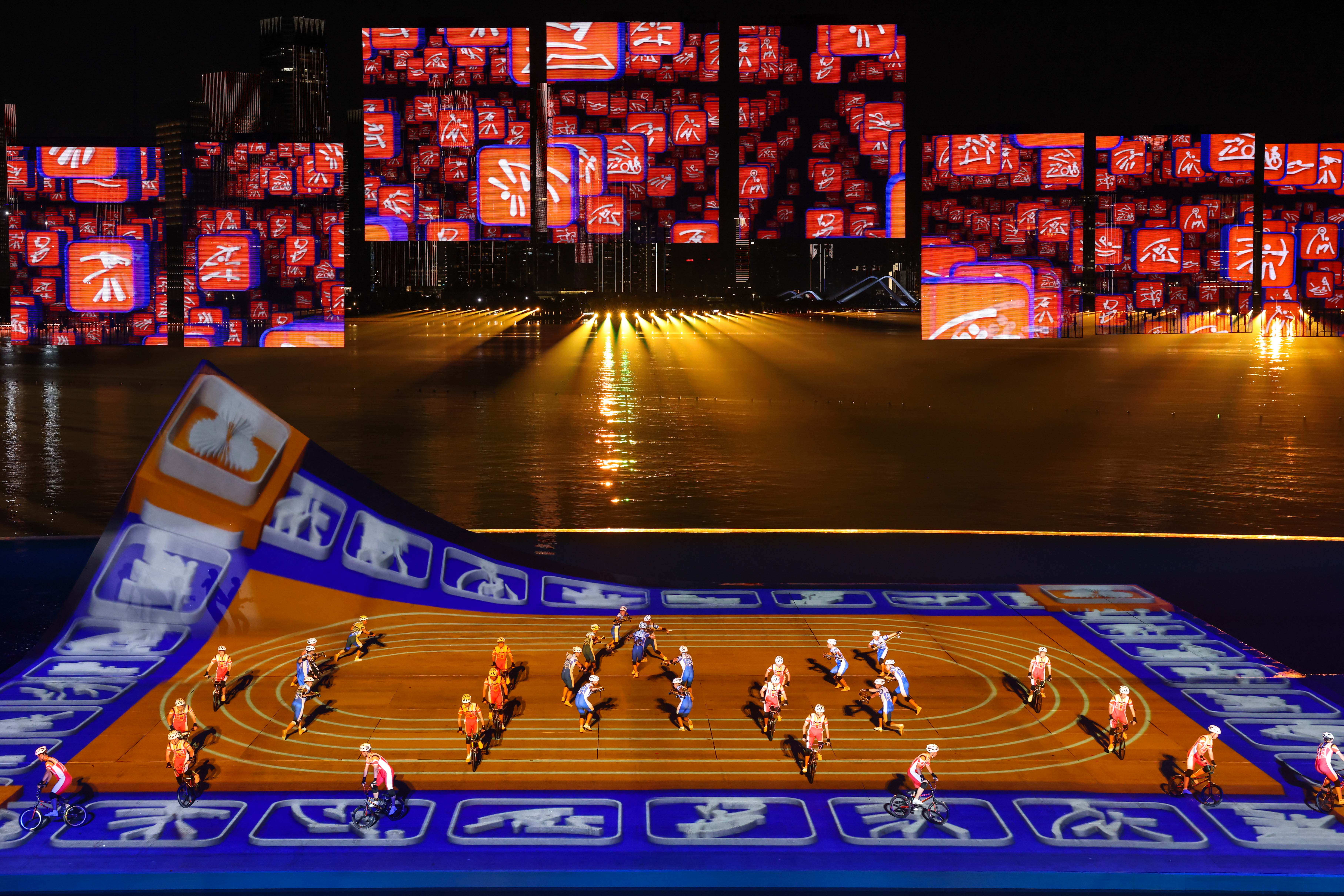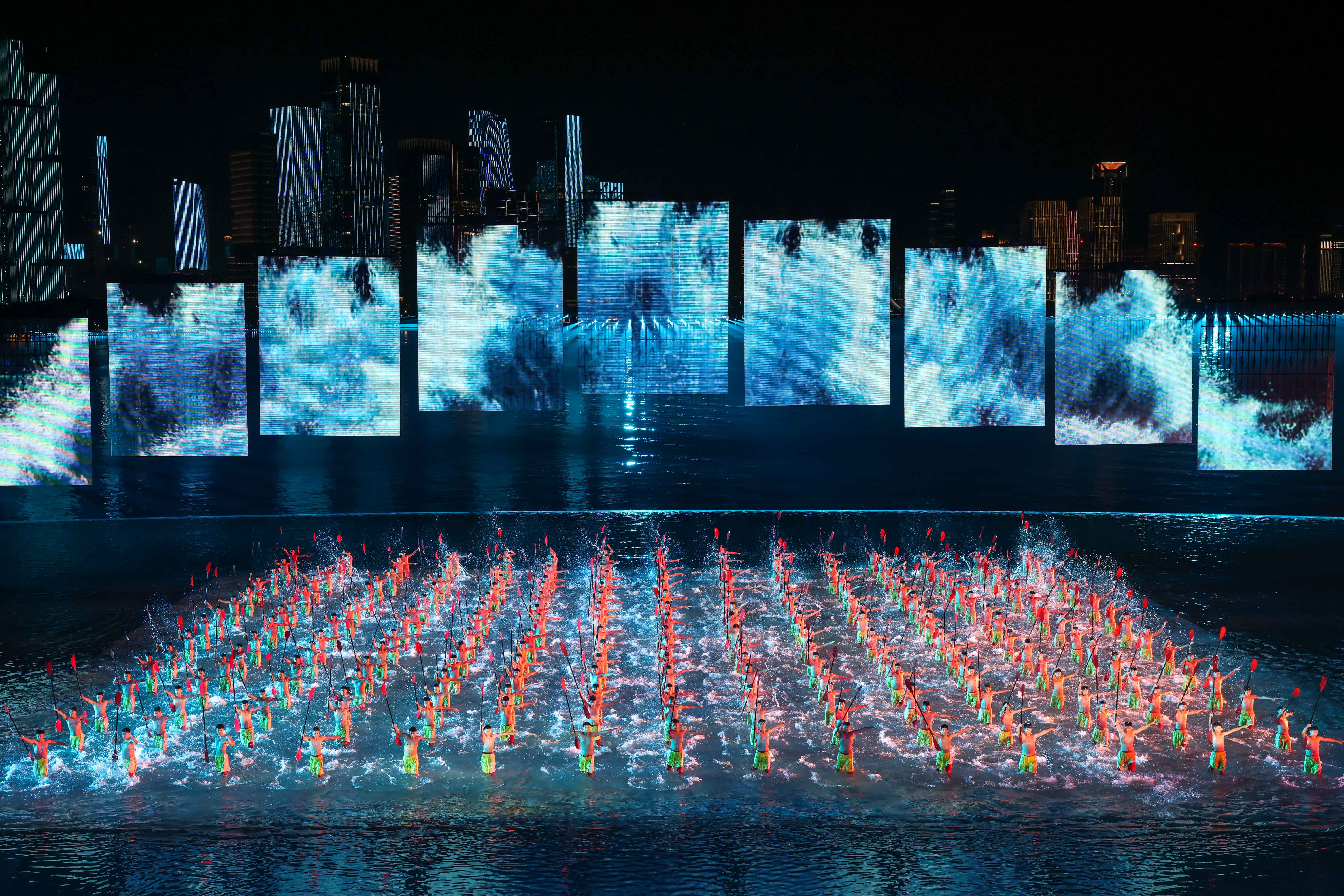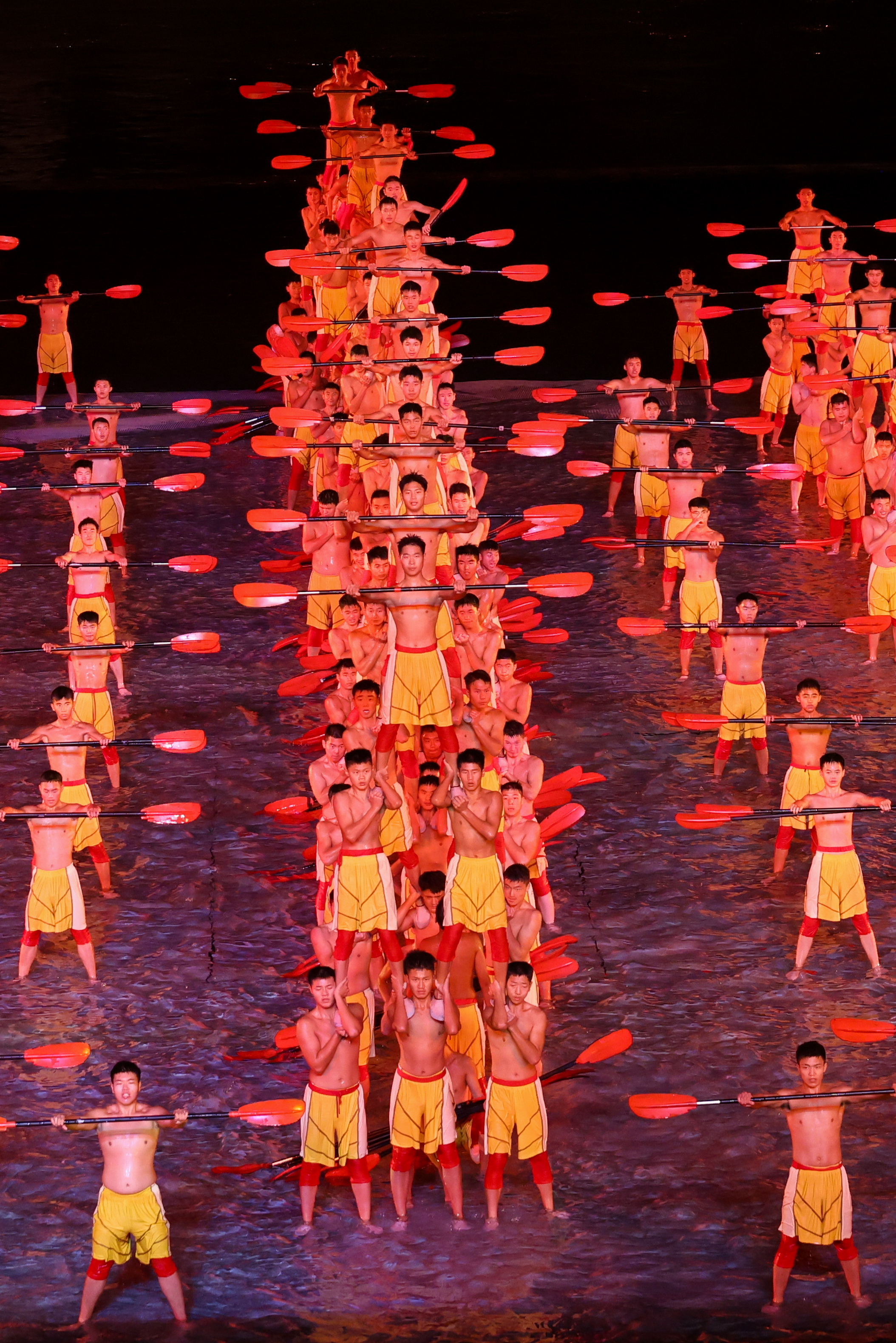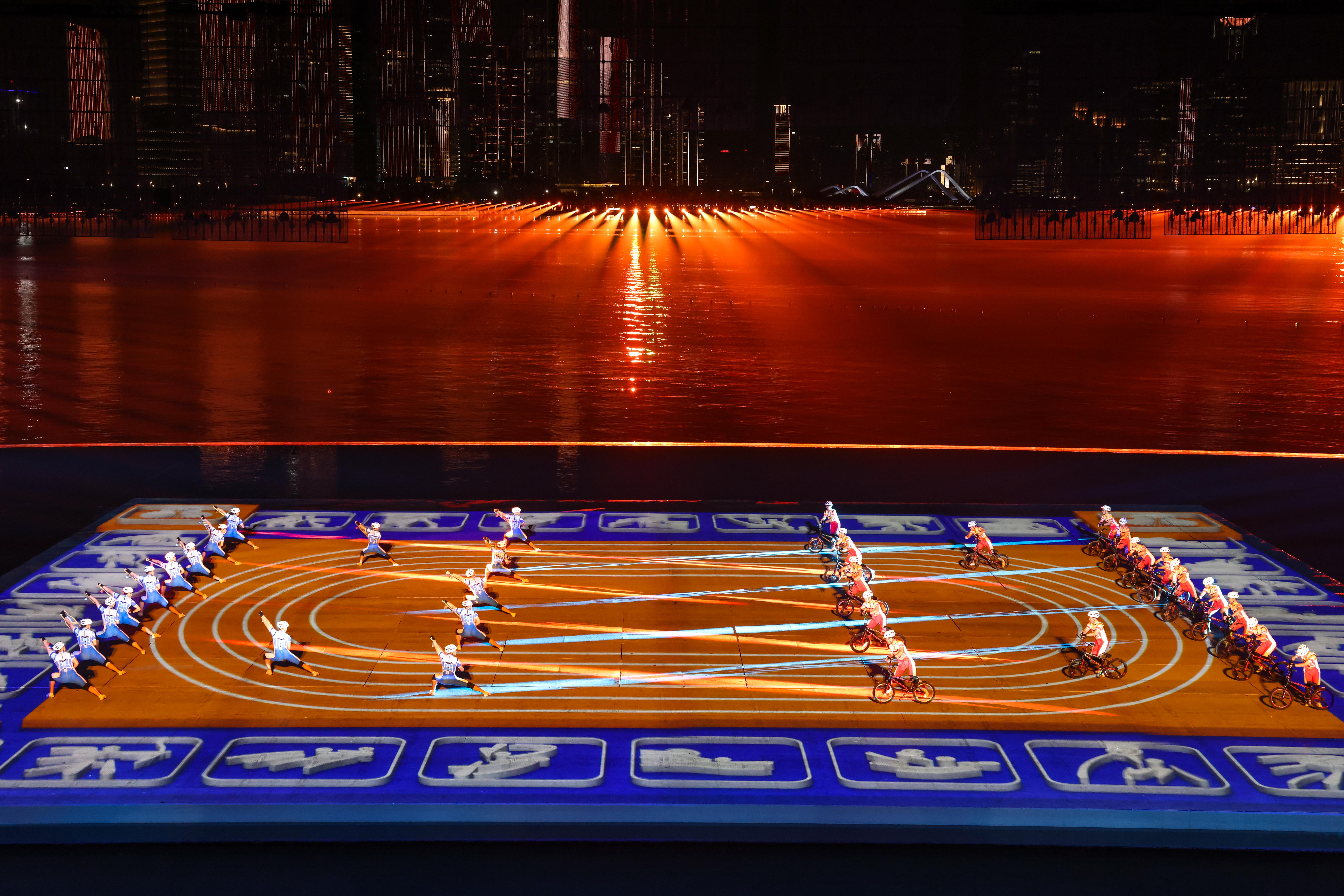 本届全运会闭幕式以“星辰大海”为主题,巧妙融合海天幕景与城市风光,打造出六个意境深远的表演段落。其中,段落四《巅峰的时刻》无疑是全场最大亮点——舞台首次实现完全沉入水中,225名塔沟功夫小子化身“中华龙舟队”踏浪登场,以气势磅礴的功夫动作模拟龙舟竞渡,他们刚劲有力的拳脚、整齐划一的阵型展现出运动之美、速度之美与力量之美;节目尾声,学员们迅速叠起三层人塔,勾勒出栩栩如生的“中华龙舟”造型,生动诠释了大湾区同心协力、奋勇争先的时代精神,引得现场掌声雷动。