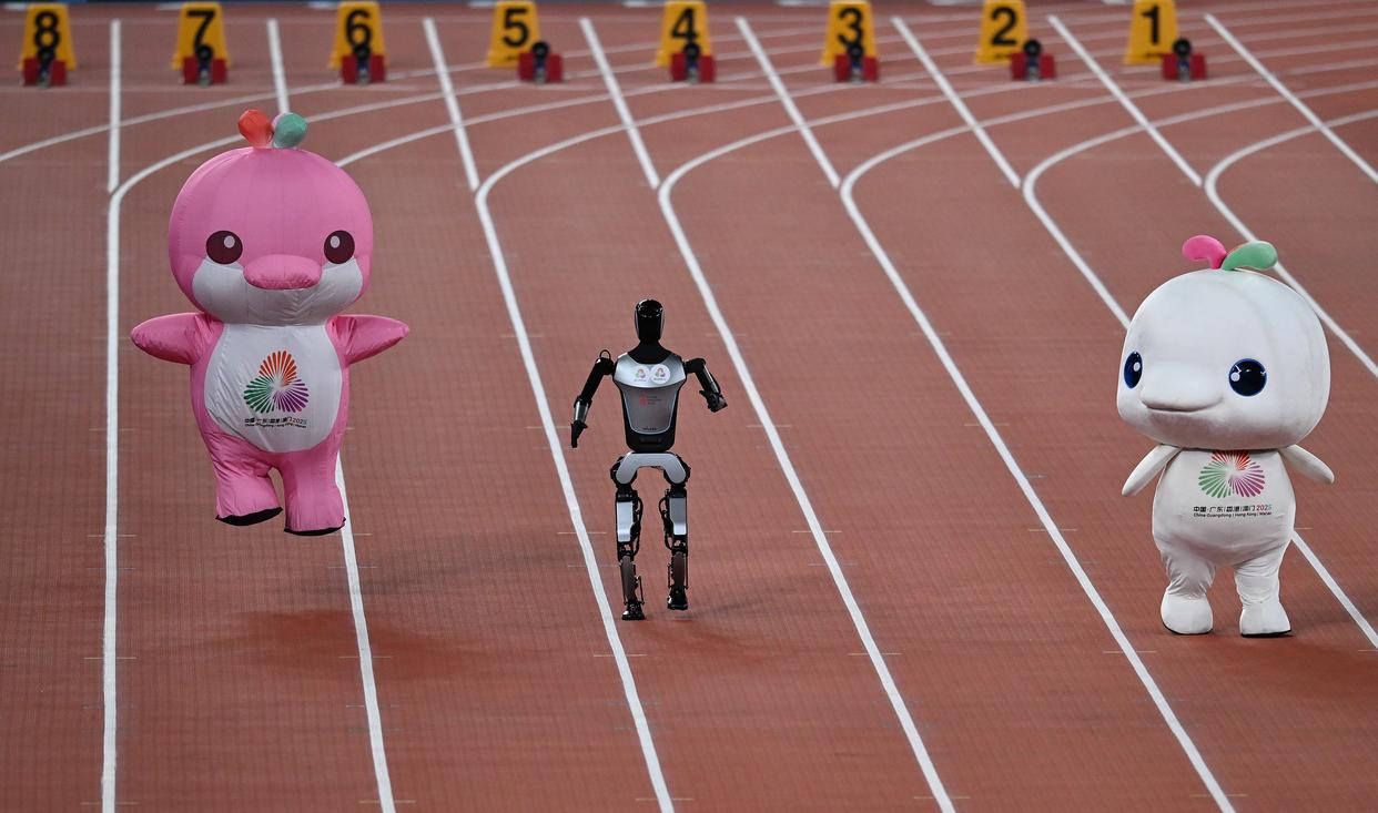 11月17日,在田径项目赛事开始前的暖场活动中,机器人和吉祥物喜洋洋、乐融融在广东奥体中心体育场赛跑。新华社记者 周牧 摄 ——伶仃洋上,大桥飞架,粤港澳同心同梦,跑出深度融合“加速度”,华夏儿女共谱时代强音。
