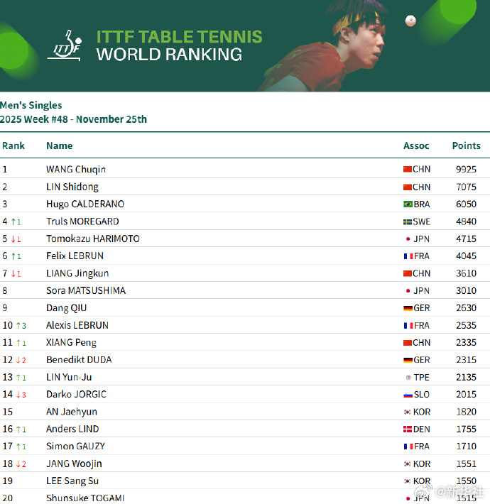 女单方面,孙颖莎11600分世界第一,王曼昱、陈幸同、蒯曼、王艺迪位列第二至第五,陈熠位第九。男单方面,王楚钦9925分排名第一,林诗栋位列第二,梁靖崑位列第七,向鹏位列第十一。